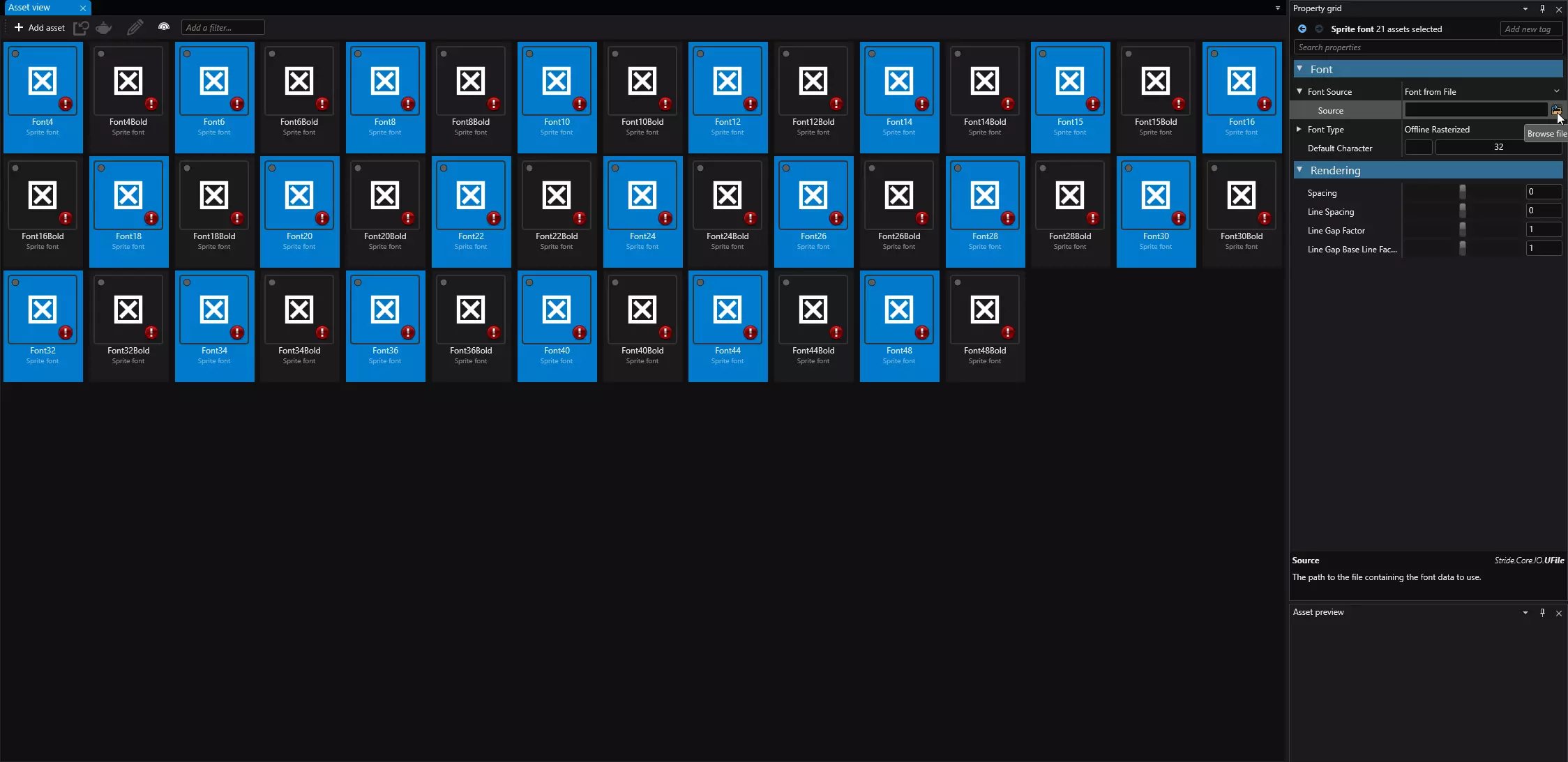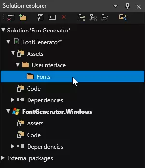 现在应打开整个预配置项目。 4. 准备用于生成的字体 继续操作前,请准备好你要使用的字体。你需要一种同时包含常规和粗体样式的字体。如果该字体需要支持其他语言,请确保选择包含必要字符集的字体。 现在打开【字体】文件夹,你会在其中找到预配置的字体精灵图——目前尚未分配任何字体。