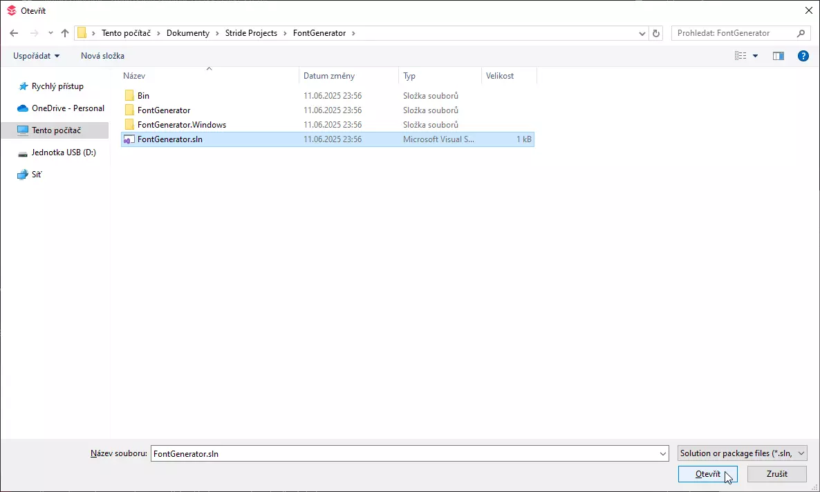 在项目选择界面中,找到已有的项目(即你解压出来的那个),然后打开FontGenerator.sln。