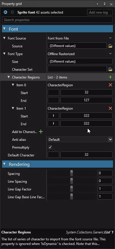 如果你的字体用于英语以外的语言,需要在属性网格中修改字符区域。若该语言使用基础拉丁语(ASCII)字符集,保留或扩大项目0的范围。你也可以为其他字符范围添加额外项目。 在这些范围内,必须包含所有所需字符。你可以通过相关页面查找它们。在搜索栏中输入所需字符,表格中的“HTML实体”值会显示类似ł的内容,它对应字符ł。 例如,如果你只需要该字符,可将字符区域设置为“起始:322”和“结束:322”。注意:角色区域包含的字符越少,生成的文件就会越小且优化程度越高。