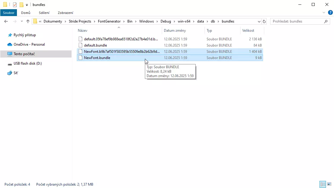 生成的文件可在解压文件夹的以下路径中找到:FontGenerator Bin Windows Debug win-x64 data db bundles 仅复制名为NewFont.bundle和NewFont.*.bundle的文件。如有需要,可在第一个句点前重命名这些文件。