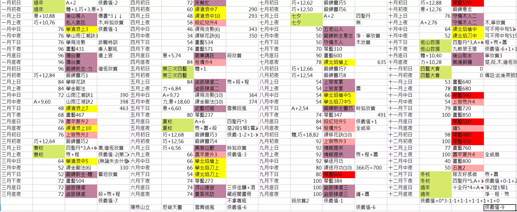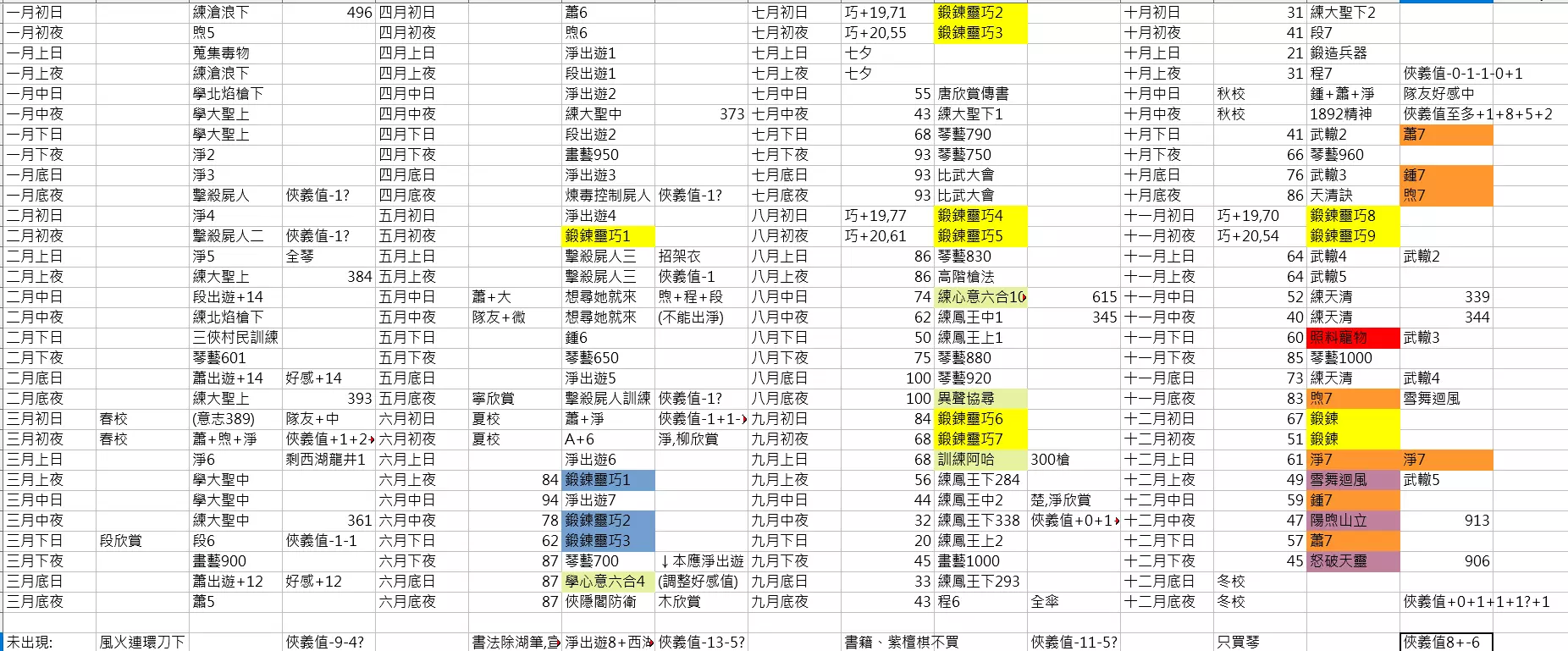 仅供参考,有些地方可以修改得更好,不过……我懒得重玩了……总算全成就顺便看完大多数的结局剧情了(各种两心相隔笑)。 剧情中的选项部分,不好意思啊……我这次没特别去记录。 不过简单来讲,除去有好感跟感悟的选项,【坚毅】>【修养】>【爽朗】>【胆识】。 不过第二年中间的时候记得去推算一下【胆识】和【坚毅】值分别要700和650,不过讲真的,如果调整一下回合,其实不用太在意……毕竟第三年可以等三月再做升阶,尤其是武艺顺序更换一下的话(个人是因为要练北焰卫的枪法所以得先冲过上官煦的五阶)。 特质部分,重点只有那个加武学经验值的,然后【前世宿慧】姑且带着吧。起手数值其实我没调得很好,不过随便说的话就是36/36/50/28,好像是这样...然后入学当晚不用赌对霍坦时的南飞鍠反击,那两点胆识就算了吧(大概是这游戏可以随机(读档)取得的数值中唯一被我放弃的)。 这轮的重点是第三年夏校之后存档,可以反复读档把五位女角的七夕剧情看一遍,然后第二年、第三年七夕都跟阿凌过可以解锁【异乡同心】,第二年夏校如果不拿毒罐子的话可以解锁【心无所向】,不过相对的段霄烈的欣赏度会少一次(建议是在第二年恒山救援的时候最终选项改成选支持段霄烈,木人心的欣赏度理论上第三年传书解掉就足够了,毕竟我恒山救援拿了之后,第三年确定在解传书之前就有关键选项了)。 我就不分章节了吧……只是简略的记录而已。