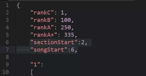 每个等级旁边的数值代表达成该等级所需的连续成功次数。 例如: 若玩家连续成功次数至少为1,将获得C级。 若玩家连续成功次数至少为100,将获得B级。 若玩家连续成功次数至少为180,将获得A级。 若玩家连续成功次数达到286,将获得A+级。 通常,玩家必须达成完美连续成功才能获得A+级,因此连续成功次数的数值必须等于敌人总数与友军总数之和。 关卡可划分为【区域】。 每当背景颜色发生变化,即表示关卡的新区域已开始。 当当前区域内的所有指令执行完毕后,游戏将切换区域。此图片展示了关卡文件的起始方式及其分段情况示例。