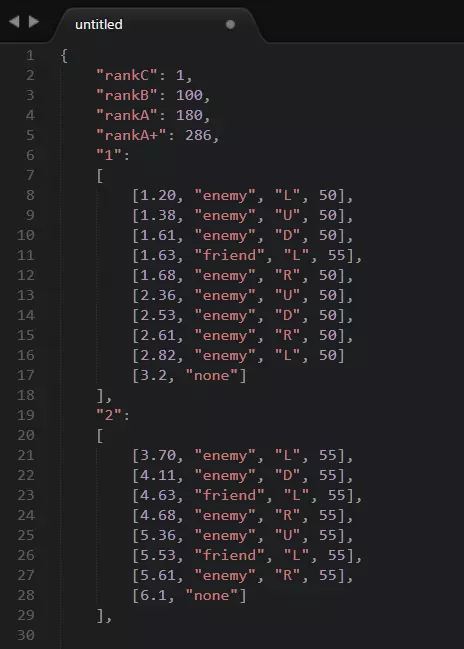 现在所有内容都应该不言自明了,除了“rotation”行中的那个额外数字。 那个1.2是旋转墙壁所需的时间。 好了,这就是本指南的第一部分。 如果这部分内容不够清晰,请告诉我们! 2 - 关卡机制 - 第二部分 在第一部分中,我们介绍了基础知识。但要完全理解关卡的运作方式,还需要更多信息。 连击与等级 关卡结束时显示的等级(从C到A+)取决于玩家获得的最大连击数。 该信息在关卡文件的开头设置: