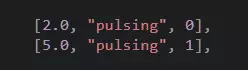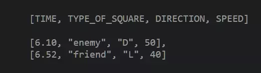 每一行都是一条“指令”,其第一个参数是该“指令”的执行时间。 需要注意的是,这个数值指的是歌曲的时间,可能与右上角显示的计时器时间不同。 示例如下: 第一行:在歌曲开始后4.34秒,创建一个从下方出现、速度为50的敌方方块。 第二行:在歌曲开始后4.50秒,创建另一个从右方出现、速度为50的敌方方块。 第三行:在歌曲开始后4.68秒,创建一个从左方出现、速度为50的友方方块。 因此,创建方块的结构如下: