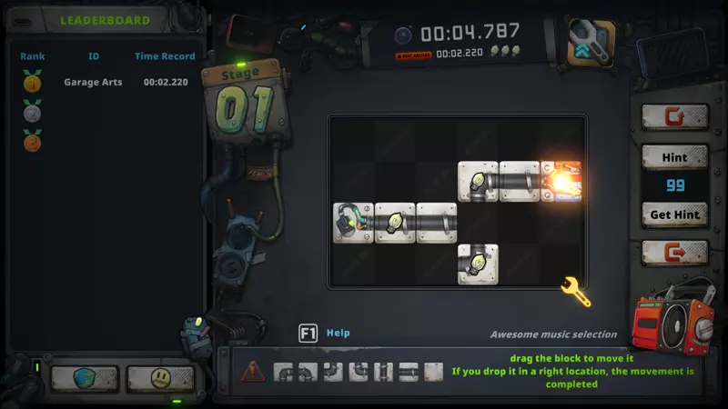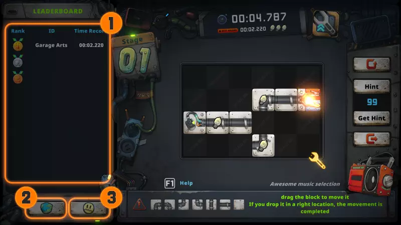 1. 普通方块 按住点击并拖动以移动方块。若将其放置在正确位置,则移动完成。 2. 旋转 点击带有旋转标记的方块可使其旋转。 3. 锁定 存在无法移动的方块。 4. 炸弹 带有红色数字的方块若移动次数超过特定数量,将会爆炸并消失。 5. 冰块 带有冰图标 的方块在连接时会冻结并变得无法移动。若移动另一个与其相连的方块,则可再次移动它。 6. 问号 带有问号的方块,其形状只有在连接后才能确认。 7. 计数 标有绿色数字的方块若移动次数超过特定数量,将变成无法再移动的方块。 游戏玩法?- 迷你游戏