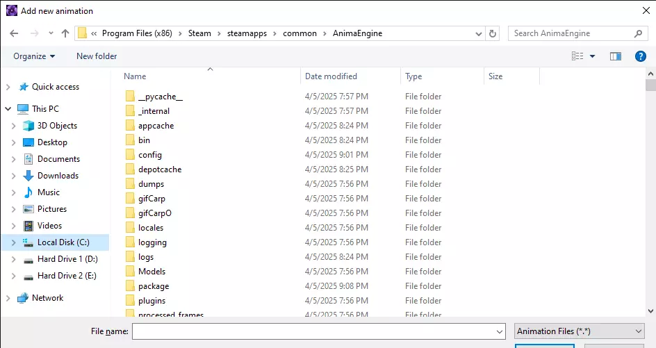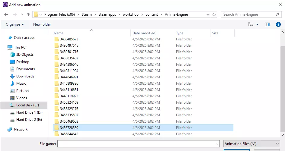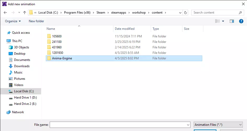 这将带您进入不同游戏的工坊文件夹,每个人的文件夹名称可能不同,因此您需要手动找到【Anima Engine】文件夹。我为了方便已将其重命名。