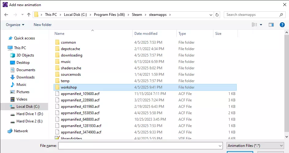 导航回Steamapps文件夹并选择workshop文件夹。