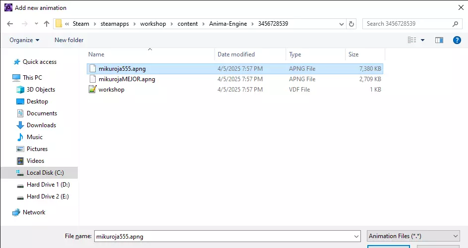 最后,选择其中一个动画文件。如果有多个文件,它们的图像尺寸通常不同。