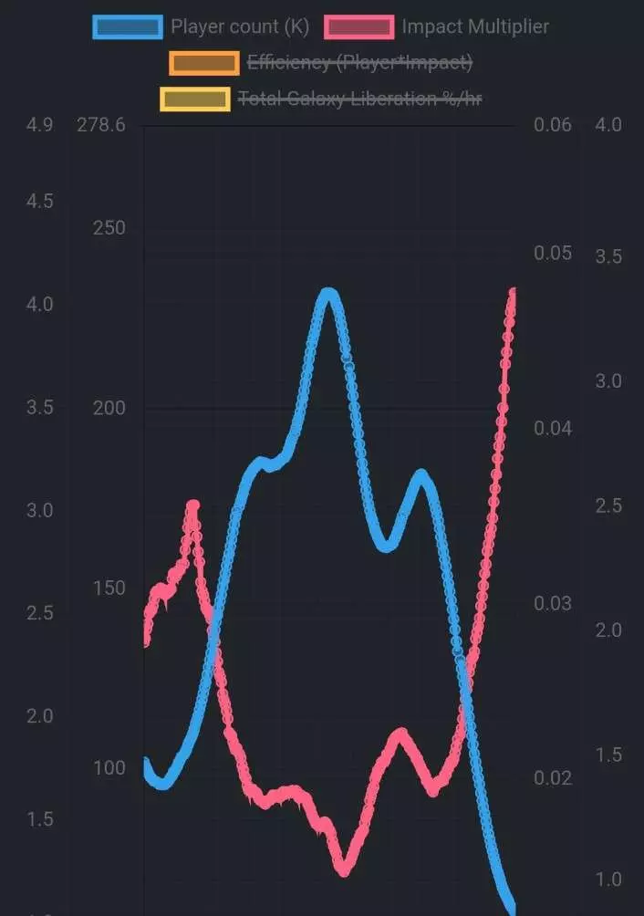 一份持续更新、专业清晰且与时俱进的指南,涵盖开箱即用的策略、基础技巧以及面向所有玩家的指南。在这里,你总能学到新东西,即便现在没有,将来也会有。每当我发现新内容,就会进行更新,所以请时常回来查看! 简介 作者注:我知道本指南需要进行一些调整,目前缺少关于【Illuminate】的信息,结构也可以优化得更好。我会着手处理,但在我完善的过程中,欢迎大家在评论区补充任何你能想到的技巧。 指南内容略显杂乱,遗憾的是每个“章节”都有字数限制,这意味着如果某个部分的技巧数量超出限制,我就需要想办法换种方式来容纳它们。目前,本指南按照不同主题分类整理了各类技巧,无论其复杂程度如何。技巧的位置安排并不重要,这只是一个非常松散的分类系统。我建议你还是通读整个指南,但如果内容显得有些混乱,那得怪Steam对每个部分设置了字数限制。我也知道现在的最高等级是“超级列兵”而非“骷髅上将”,但说实话,我短期内不会把这个指南的酷炫名称改成“来自超级列兵的专业技巧”。 各部分大致分类如下: 介绍:指南本身的介绍,包含目录。 基础:除战斗外的基本游戏机制。 数据:关于游戏运作方式的信息,包括日期、时间、统计数据等。- 该蛋会掉落2个超级样本和4个稀有样本。相关信息可能会发生变化,但如果你觉得为了获取该蛋而无法使用战略装备且只能使用副武器是值得的,那么尽管去拿吧。 - 玩家数量少并不意味着影响力小。从下图中可以看出,活跃玩家越少,每个玩家的效率就越高。在线玩家越少,每个地狱潜者的效率就越高;反之,在线玩家越多,他们的效率就越低。不过,这并非坏事,也不意味着玩家数量少时我们表现更好,只是说明无论玩家数量多少,我们的整体效率都是一样的。环境:外星行星的生存预期及应对方法。 武器:通用武器技巧、枪械功能及使用方法。 战略配备:各类战略配备的通用信息。 通用战斗技巧:本质上是“基础”部分中的战斗专项内容。 击杀虫族:针对消灭泰伦虫族威胁的专项信息。 击杀机械族:针对消灭机械军团威胁的专项信息。 击杀鱿鱼族:针对消灭 Illuminate 威胁的专项信息。 基础 - 不要使用开放式麦克风。你是否每局游戏都被踢出?毫不意外,没人想听到婴儿哭闹、对着麦克风呼吸或背景里的风扇噪音。检查设置并确保你的麦克风设为按键说话,因为没有什么比和一个全程不怎么用麦克风,却用它来分享自己张着嘴吃薯片这件事的人一起玩更让人恼火的了。说真的,这是本列表中最重要的提示。 一些操作:这里有一些教程未涵盖的基本操作。我保证后面的提示会更有用,我们只是在为新手慢慢开始。 标记物品:按Q 丢弃物品:按住X 对自己使用补给包:按5 样本、 requisition slips、勋章和超级信用点无论谁拾取都会共享。在这一点上, requisition slips、勋章和超级信用点在你拾取时就会添加到你的账户中,这意味着你实际上不需要撤离就能保存它们。样本显然是另一种情况,需要玩家携带它们撤离。无论如何,所有资源都是共享的,不管谁携带,所以尽可能收集吧! 大多数资源都有上限,所以要花掉它们!我知道,一旦你的勋章和 requisition slips 达到上限就无法再获得,这有点糟糕。我希望能有某种系统让你可以消耗资源,这样至少还能继续获得它们。不过算了,言归正传: requisition slips:50,000 勋章:250 普通样本:500 稀有样本:250 超级样本:100 等级:150 如果你在达到上限后继续收集,超出的部分会被浪费。所以如果你在为下一个通行证存勋章,记得花掉一些,这样就不会因为完成每日任务等获得的勋章而损失了。据我所知,超级信用点没有上限,也不清楚为什么会有上限。 普通样本在开始时是最高优先级,然后才是稀有样本。我知道这看起来是个奇怪的建议,但稀有样本的使用量出奇地少,而且在7-9级难度下,任何像样的玩家都会确保每个任务至少获取3个超级样本。但几乎所有的飞船升级都需要至少80个普通样本,这加起来数量非常多。如果你必须在10个普通样本和3个超级样本之间做出选择,那就选普通样本。这种情况可能会随着计划中几种新样本的加入而改变,所以相关时我会更新,但就目前而言,你要尽可能多地获取普通样本。不过,到了后期升级阶段,你会极度缺乏稀有资源,这时两种资源的价值就相当了。关键在于,超级样本通常是优先级最低的。 尝试所有东西。这一点可能有些争议,但一定要试试所有武器和战略装备。我的意思是,武器的好坏取决于使用者,而非武器本身。如果你喜欢某种武器的手感,就用它。一个精通激光加农炮的玩家,比一个只因为某个视频博主推荐就使用轨道炮的新手要高效得多。选择你喜欢的武器,并努力熟练掌握它。此外,为不同情况准备不同的装备配置也很重要,虫族、机械族和光灵族各有不同,它们有着不同的弱点和优势。有些武器对特定敌人效果更好,有些则效果较差。尝试所有事情一次。 鹈鹕号一旦着陆就会停在原地。你可能知道,如果你在呼叫鹈鹕号时离开撤离点,整个流程和倒计时都会取消,你必须重新开始。但一旦它着陆后情况就不同了。鹈鹕号降落后,你可以直接离开撤离点。所以,如果你已经完成了主要任务目标,但还想完成支线目标,又不想为呼叫撤离而感到压力,那就派一个人去呼叫鹈鹕号并照看它直到着陆,然后再跑回来帮你。我不建议和随机队友这样做,