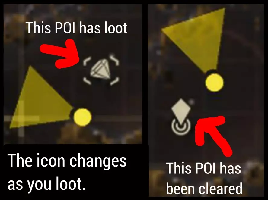 环境 钻石代表战利品,指针则不代表。如果你在地图上看到钻石,意味着那里有战利品,可能是兴奋剂、弹药、样本等等,总之钻石就表示有东西可以拿。而指针则表示那里没有东西了。这其实是很明显的事情,但总有人让我补充说明,而且我也经常在网上看到相关帖子,显然对有些人来说这并不是那么显而易见。所以记住:钻石代表有战利品,指针代表没有战利品了。