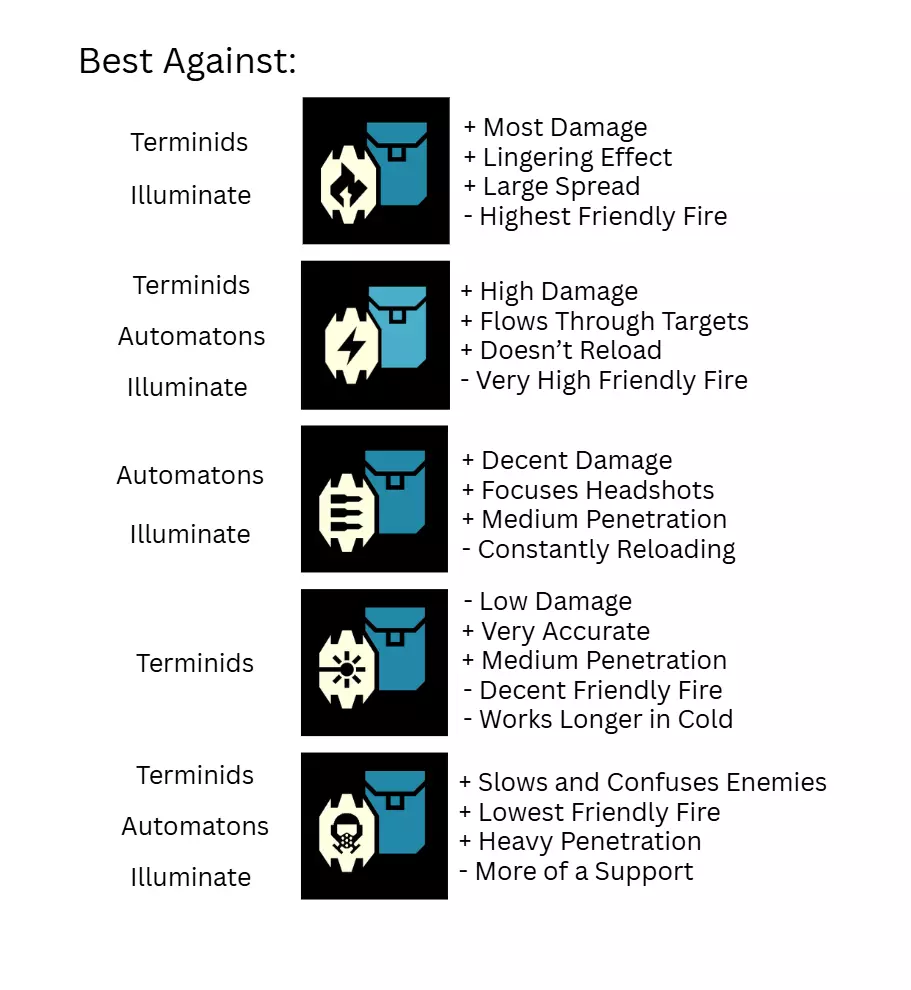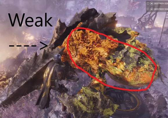 爆炸类武器对弱点造成双倍伤害。非爆炸类武器对弱点造成10%的伤害加成,爆炸类武器则造成100%的伤害加成。需要注意的是,这里所说的“爆炸类武器”特指具有“爆炸”属性的武器。开发者对这一概念的表述有些模糊,像自动加农炮是否算作“爆炸类武器”也不明确,但一般认为,如果朝自己脚下射击会造成自伤,那么该武器就算作爆炸类武器。 弱点包括冲锋者的尾部、 Hulk 的通风口以及被摧毁装甲下的肉体等部位,这些部位会受到此类武器的显著额外伤害。在装备武器前,要了解其用途。此外,这些武器会造成自伤,因此如果要击杀脚边的虫子,建议切换到副武器。