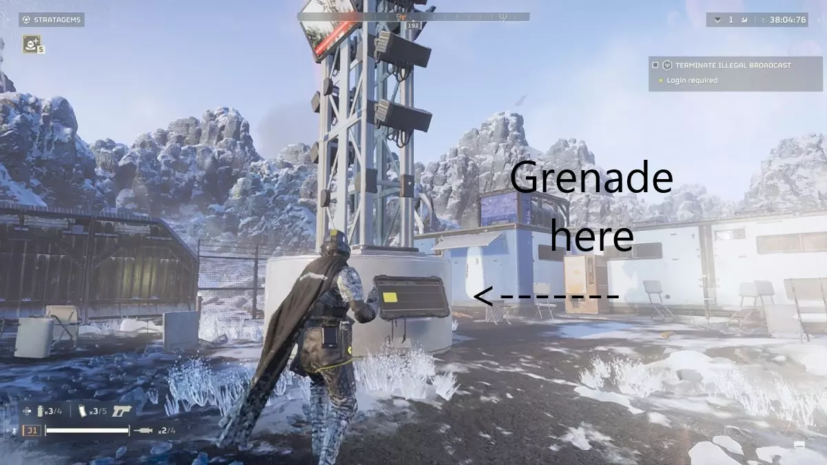 一颗手榴弹扔向显示器就能完成“终止非法广播”任务目标。就是这么简单。虽然游戏会引导你激活终端并通过两个简短步骤来完成任务,但如果你赶时间,只需向终端扔一颗手榴弹就能结束任务——只要摧毁它就行。这是最节省资源的方法。不过,你也可以用雄鹰打击或轨道打击瞄准显示器,只要摧毁显示器,信号塔就会倒塌,支线任务就能完成。你还可以用爆炸雄鹰打击或机炮射击塔顶来摧毁信号塔,但这种方法不太可靠,并非每次都有效,所以我建议直接用手榴弹炸显示器。如果你瞄准得当,也可以使用自动炮射击或类似武器远程摧毁哨塔。