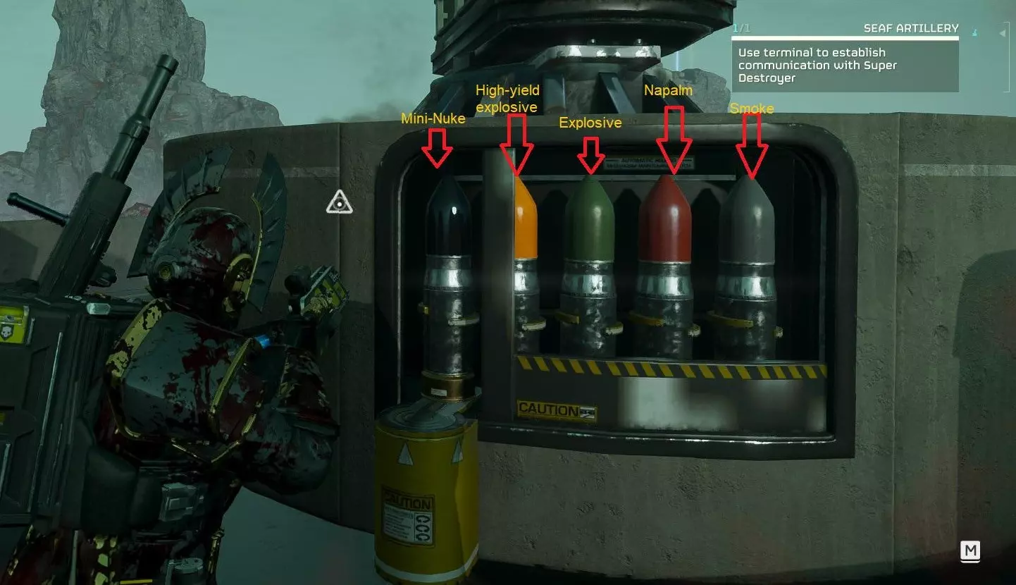 - 在水中你只有五秒时间,除非你驾驶着机甲。就是这样。如果你想从A处游到B处,必须在五秒内完成,否则你会溺水身亡,并且很可能永久失去身上携带的所有物品。总的来说,要避开水域,它的致命性极高。但如果你不慎落入水中,一定要在倒计时结束前离开。唯一的例外是机甲,它能让你在较深的水中跋涉而不会溺水。显然,在此过程中要确保待在机甲里,否则你会失去它。总之,想在水中待超过五秒?试试机甲吧。完全不想冒险?那就绕远路。身上有贵重物品?那就别考虑靠近水域。 - 【SEAF】炮弹是有颜色编码的。目前开发者已对这些炮弹的颜色和形状进行了多次调整,因此相关信息可能会发生变化,但就目前而言,它们的对应关系如下: 黑色 - 微型核弹 黄色 - 高爆弹 绿色 - 爆破弹 红色 - 凝固汽油弹 蓝色 - 静电场弹 灰色 - 烟雾弹 我已按优先级顺序列出它们,尽可能按此顺序装填。也就是说,微型核弹放在发射器的第一个位置,烟雾弹放在最后一个位置,这与图片中的放置顺序相反。你需要将最强大的武器放在首要位置。有时在混乱中无法按最优顺序操作,所以如果必须在最优顺序和快速装填并撤离之间做出选择,那就选择快速完成装填。