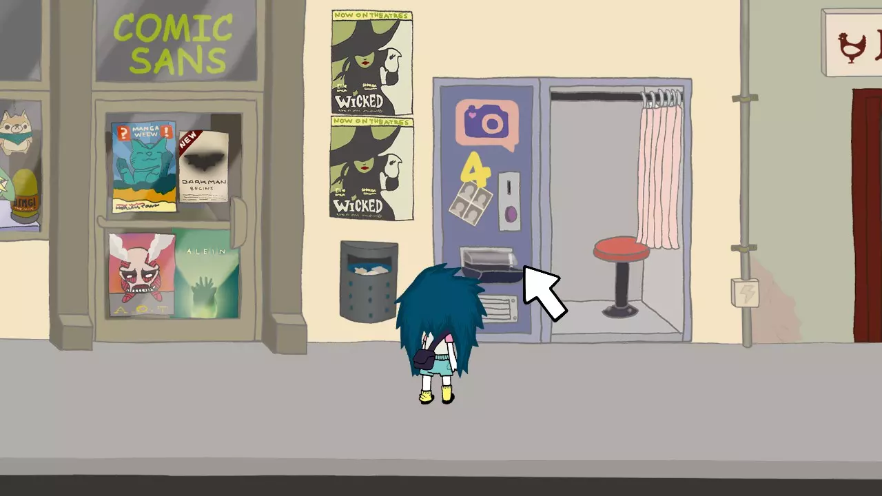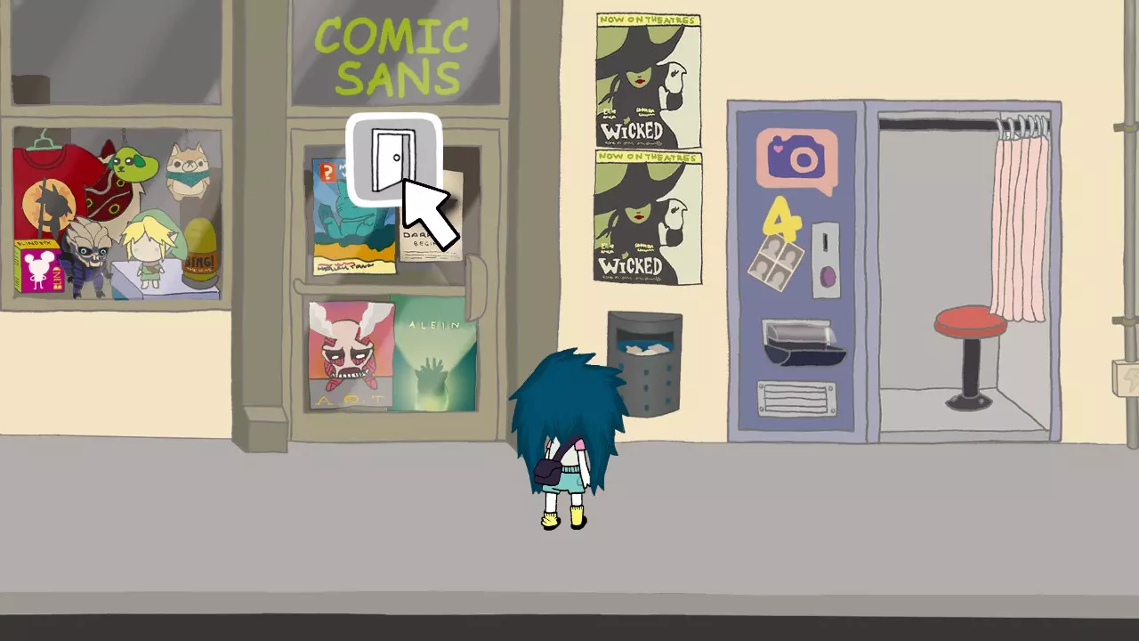 新外观 你在图书馆假扮妮卡,并且成功蒙混过关。 从手推车上拿起书。 把书交给图书管理员。 离开图书馆。 向右走并进入漫画字体商店。 用谜之书对那位女士使用,以获得红色长袍。 离开商店。 向左走并进入服装店。