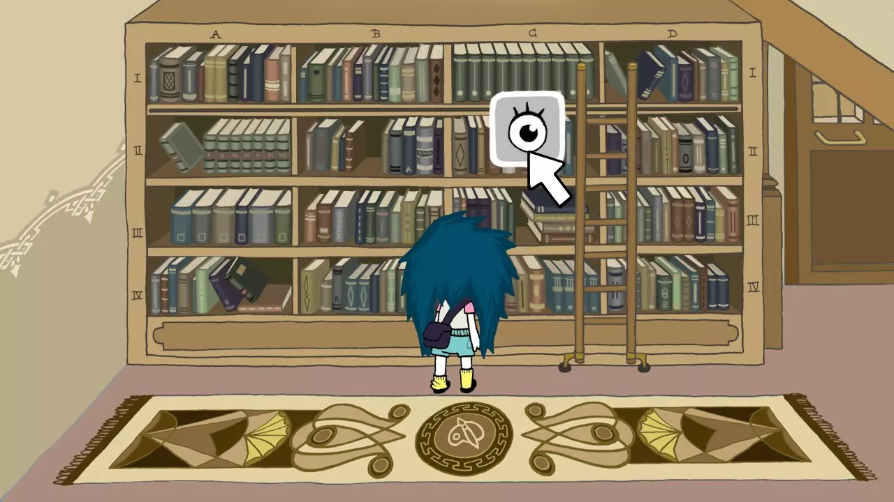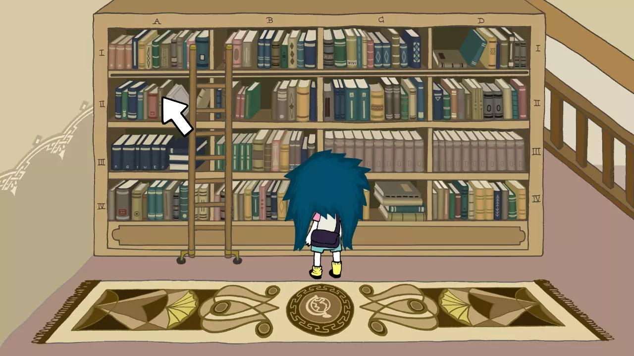 与展示柜里的红色兜帽互动并检查它。 和女孩对话,直到对话结束。 离开商店。 向左走并进入图书馆。 向左走并使用电梯。 使用电脑,搜索【Enigmarillon】。 向右走并进入艺术区(第四个)。 将梯子向右移动。 查看C2。