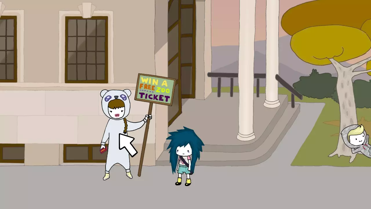 和那个穿着熊猫装举着牌子的女孩对话。 我要试着免费拿到票。 好的。 猫。 公鸡。 驴。 狗。 我没什么别的要跟她说了。