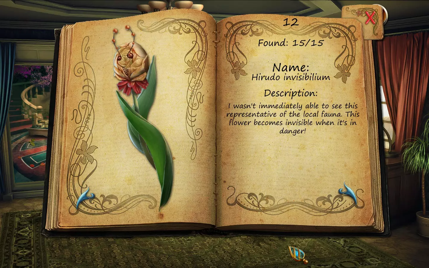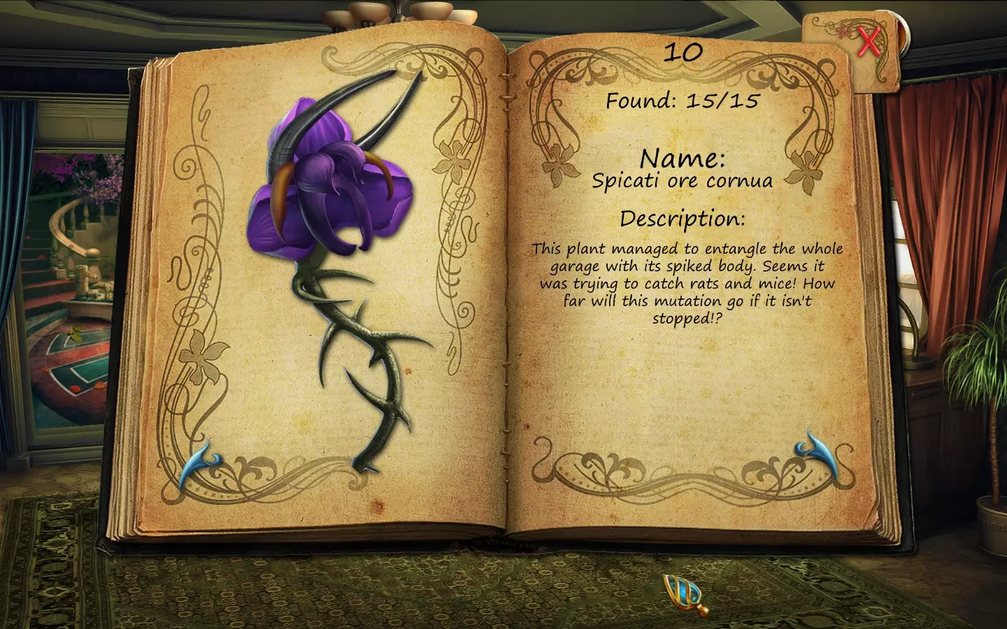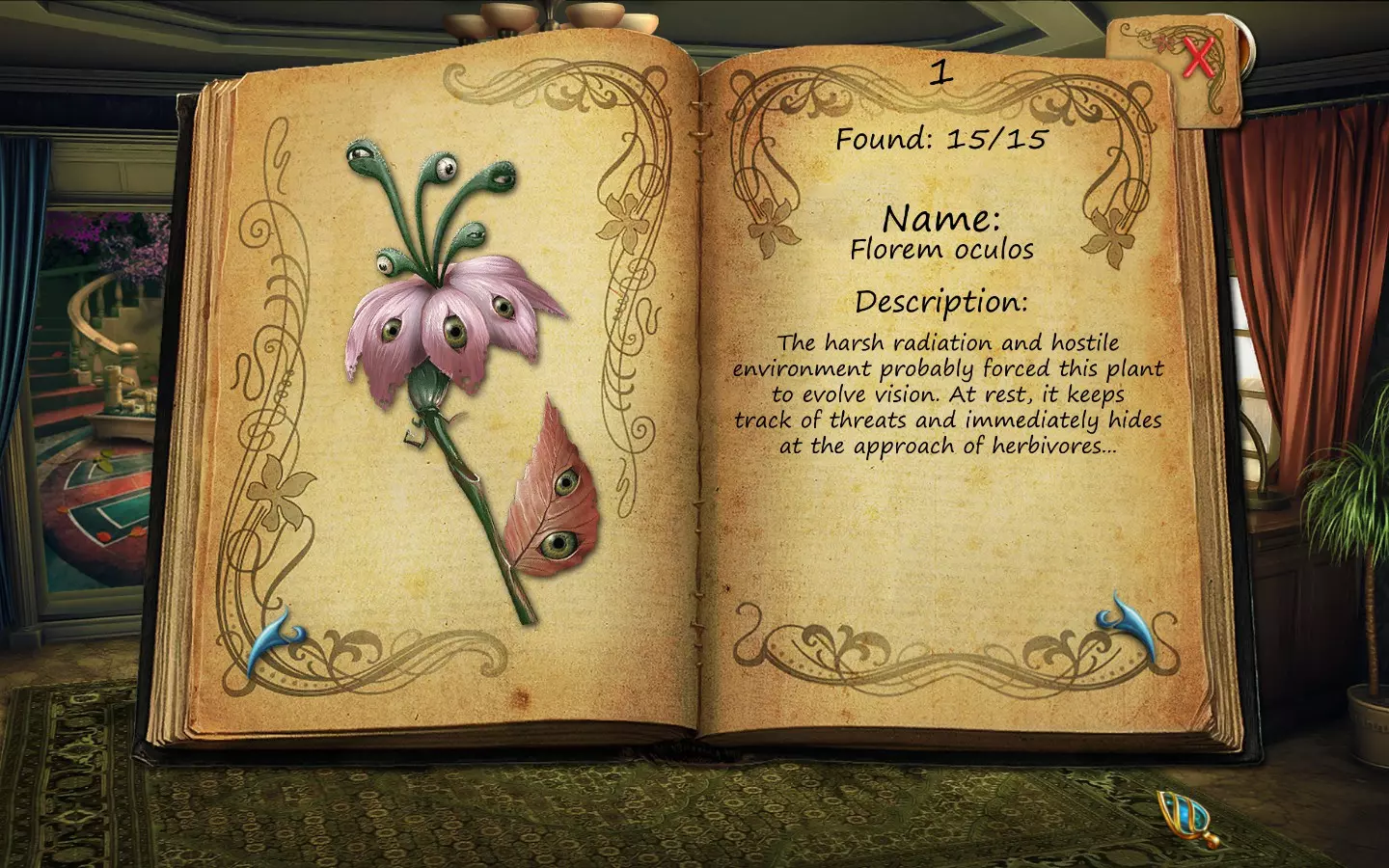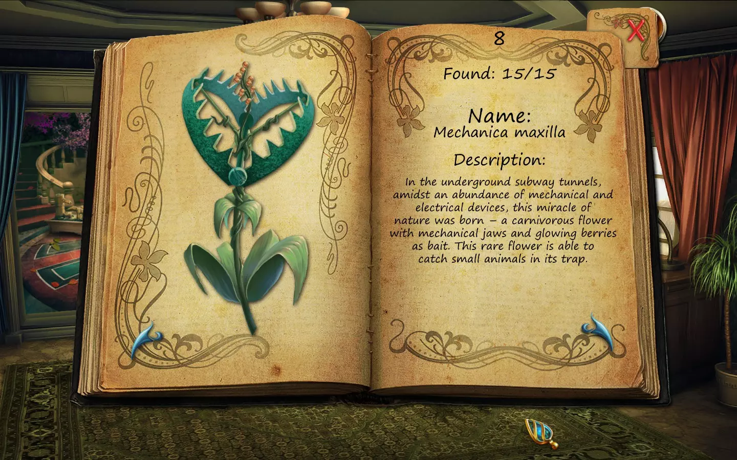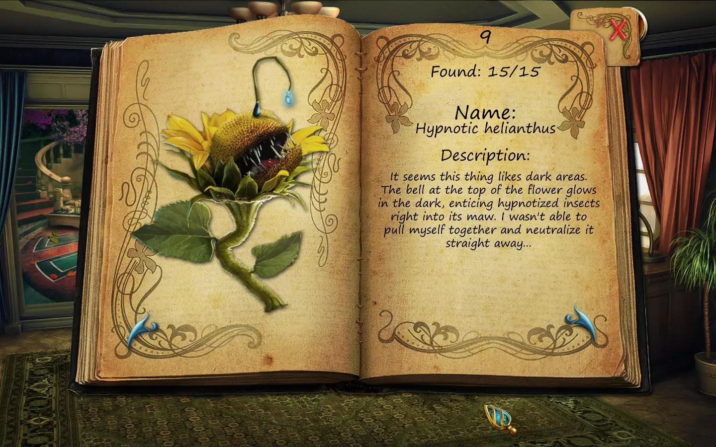 花朵(仅文字说明) 按获取顺序排列(含页码): 1. 花之眼 - 照相馆 2. 火焰花 - 废墟建筑 3. 蛇形植物 - 洗衣房 4. 寄生蟹花 - 下水道出口(需关闭水源) 5. 6. 齿牙仙子花 - 商店 7. 孔雀羽花 - 加油站 8. 机械颚花 - 地铁站 9. 催眠向日葵 - 古董店 10. 尖牙角花 - 车库 11. 荧光花 - 实验室 12. 隐形水蛭花 - 城市入口(首次访问时不可见,需稍后返回) 13. 鱿鱼兰花 - 废弃地铁站 14. 蝎爪花 - 实验室交叉路口 15. 迟缓蜂花 - 被淹没的公交车水晶之谜 - 教授办公室 注意:“隐形水蛭花”其实可以比列表中记录的时间更早获得,但这是我在最近一次游玩时记起来去查看它的时间。 花朵(含图片) 按获取顺序排列(附带页码)。在每张图片中寻找手形标记。 2. 火焰花 - 废墟建筑