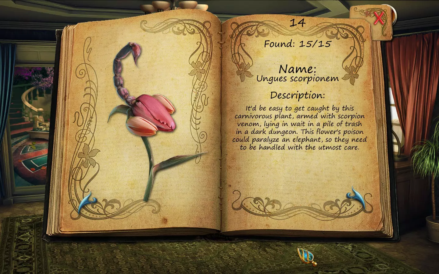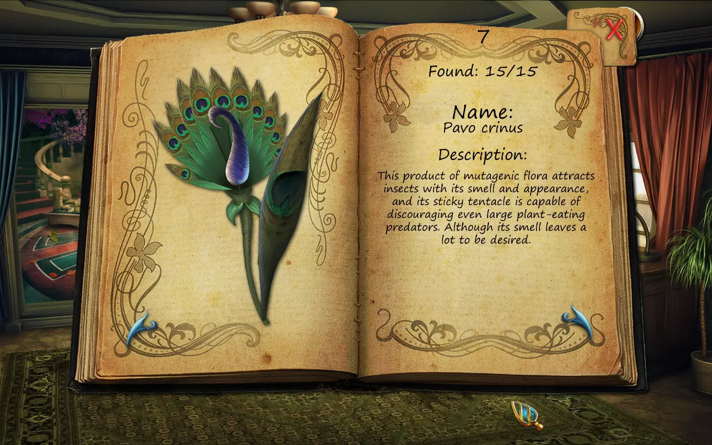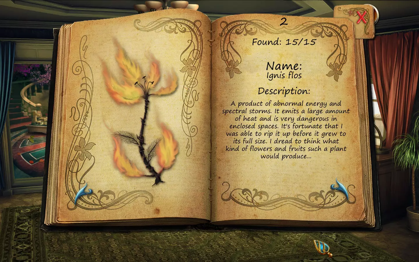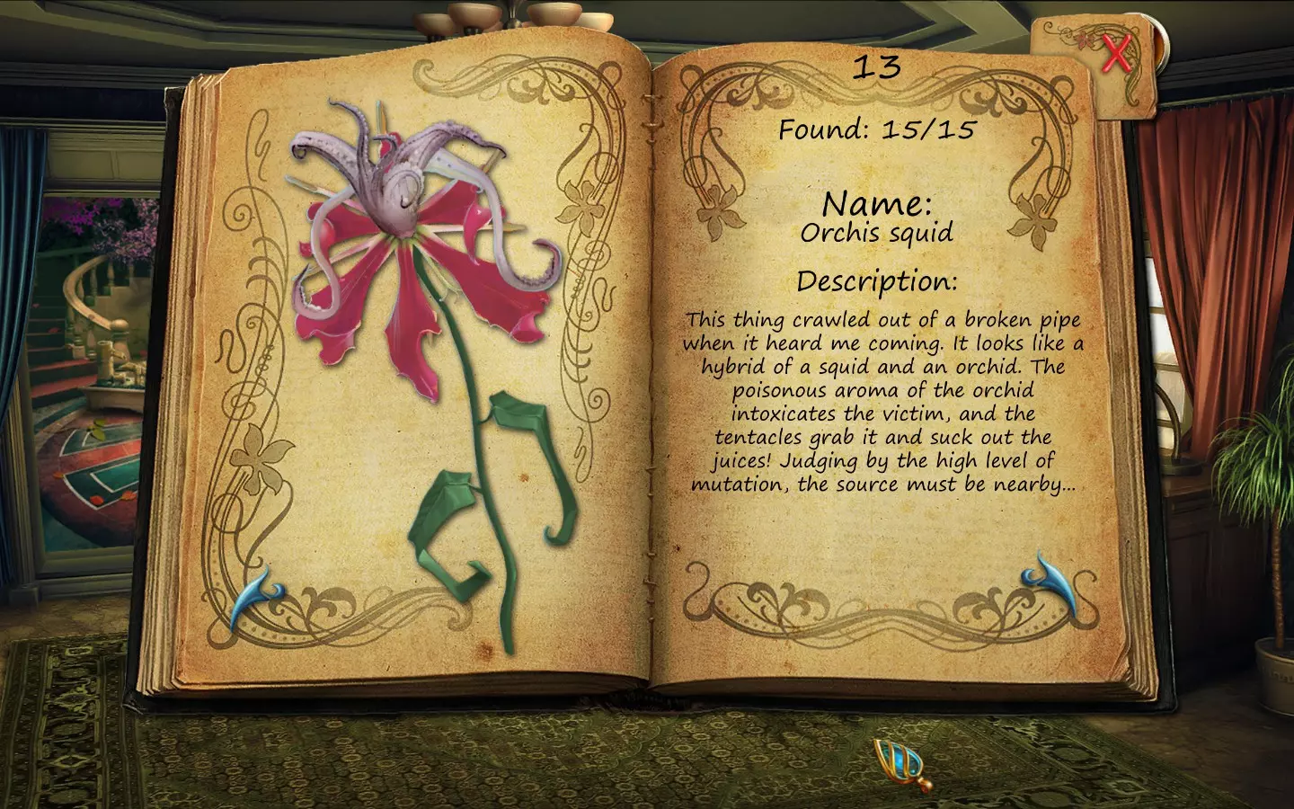 花朵(仅文字说明) 按获取顺序排列(含页码): 1. 花之眼 - 照相馆 2. 火焰花 - 废墟建筑 3. 蛇形植物 - 洗衣房 4. 寄生蟹花 - 下水道出口(需关闭水源) 5. 6. 齿牙仙子花 - 商店 7. 孔雀羽花 - 加油站 8. 机械颚花 - 地铁站 9. 催眠向日葵 - 古董店 10. 尖牙角花 - 车库 11. 荧光花 - 实验室 12. 隐形水蛭花 - 城市入口(首次访问时不可见,需稍后返回) 13. 鱿鱼兰花 - 废弃地铁站 14. 蝎爪花 - 实验室交叉路口 15. 迟缓蜂花 - 被淹没的公交车水晶之谜 - 教授办公室 注意:“隐形水蛭花”其实可以比列表中记录的时间更早获得,但这是我在最近一次游玩时记起来去查看它的时间。 花朵(含图片) 按获取顺序排列(附带页码)。在每张图片中寻找手形标记。 2. 火焰花 - 废墟建筑