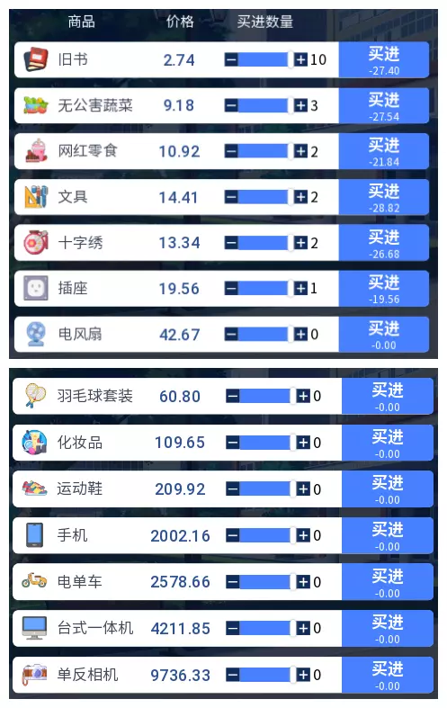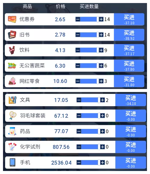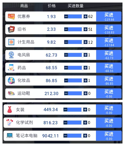 第三步 摸鱼等过关 完成了以上步骤,剩下的日子就可以随便跳过,直到50周结束的大结局了。解锁的【HE】是不能立即查看的,要打开下一轮游戏,点开日记本才能查看。做到了这一切的你,就请满怀期待打开你的日记本,静静欣赏你与她共度的美妙时光吧! 1.2 全日记本解锁攻略 如果你看着日记本上的一个个锁头很不爽,就请继续阅读接下来的教程,体验到全部的游戏剧情吧。 1.2.1 【BE】、【NE】 共通线的【BE】是很容易触发的,这个大家应该都知道,我不多赘述。妹子个人线的BE需要满好感,但人气不达标才能触发,只需要注意不要做任何增长人气的行为(招募极道复制人,办活动)就可以解锁,BE和HE不能在同一周目达成。 NE则是人气达标,但没有和任何一个妹子建立恋爱关系(好感不到80),此处建议招募喜欢、一般社团的女生,然后通过招募极道复制人以及举办活动的方式增长人气,并且不要约会,就可以达成NE。 1.2.2 偶遇 多进行几次游戏,基本偶遇就不知不觉齐了,这里也不再赘述。 1.2.极道复制人会每周收取一定费用,给社团增长固定值的人气。如果加薪的话,提供的人气也会上升,极道复制人最多只能加薪两次,加薪两次后的人气增长值就是他的极限了。前期资金不足时,可以雇佣一些收费便宜的极道复制人给社团增加基础人气;后期资金充裕后,就可以通过【SL】的方式招募强力的极道复制人,来大量增加人气。具体应该如何安排,就看你自己如何搭配了。(每位极道复制人的详细数据请参考3.4)4 活动 举办活动可在地点直接花费一定金钱,增长一定数额的人气。当某位女生的好感度达到40时,举办活动会得到该女生的帮忙,同时该女生好感度+2。若有两位女生的好感度都达到40,则会开启修罗场事件,导致好感度较低的一方离开社团,此时不建议开展活动。请在女生争风吃醋之前,尽可能多举办活动以增长基础人气。 每个活动举办时都有可能出现特殊事件,可通过女生电话的预报得知特殊事件的地点及对应活动。各活动的特殊事件效果如下: 社团咨询:减免活动费用。建议在初期举办,可节省一部分资金。义卖会 获得物资捐赠,按一定比例赠送货品填满库存。当存在义卖会的特殊事件时,尽量多扩充库存以获得更多的物资。 展览 库存商品以进价的2倍价格卖出。注意,如果你的库存商品是从义卖会或者大奖赛中获得的,该商品就会以0元价格被售出。如果在使用该功能前没有库存,也可以购买该地区的商品,再举办活动,同样可以以进价的两倍价格售出以获得收益。 现场选秀 获得人气加成,库存商品以2倍价格卖出(可能只出现一种也可能两种都出现,前者概率更高)。 大奖赛 获得人气加成,减免活动费用,获得物资捐赠(出现其中一种或者两种,第一种概率更高)。以上就是大概的刷高分攻略,请参考本条攻略以及辅助资料,拿下最强社长的称号吧! 三.辅助参考资料 本条为游玩过程中可能会需要的各种信息,请有探索游戏愿望的玩家谨慎使用本条目,由于本条资料完全取自游戏内容,未涉及游戏底层信息的探索,如发现有误,请及时向本人反映,本人会及时修改。 3.1 各区域物价信息 以下为各个区域的物价信息,请根据图片寻找对应地点,使用目录跳转至对应地点的物价信息进行查询。 地点后缀为【自由交易】时,表示该区域的商品可以自由买卖。 地点后缀为【仅出售】时,表示该区域仅能出售列表中的商品,无法购买。地点后缀为【仅购买】时,表示该区域仅能购买列表中的商品,无法出售。 注意!图中物价仅为正常价参考,实际物价会有一定浮动,请在资金充足时使用! 3.1.1 高新区物价信息 (特别注意,该区域的旧货市场可以自由交易游戏中所有商品,故不再特别提供信息。)3 修罗场 这是剧情解锁的一个难点,触发条件为“两位女生好感度同时达到40,举办活动时即可触发”,但该条件需根据女生对社团的态度不同,分两部分详细说明。 第一部分 我与最爱和喜欢之间的惨烈修罗场 要达成此修罗场,需将最爱和喜欢两位女生同时招募进社团。当喜欢女生的好感度达到40时,进行存档,然后举办活动,即可触发两位女生的修罗场。需要注意的是,修罗场触发后,好感度较低的一方会退出社团且不再回来,并触发退场剧情。不过提前存档,在触发后读档不会影响剧情解锁,由于女生退出社团会对人气增长产生大量负面影响,因此需要进行存档读档操作。值得一提的是,人气的大量增长同样离不开活动的举办,修罗场条件的触发意味着自此以后不能再举办活动,请需要刷分的社长们多多留意好感度,不要因为女生们的争风吃醋,浪费了举办活动的大好时机哦。 第二部分 我与最爱和一般之间的惨烈修罗场 即使五位女生全部按照第一部分的流程解锁了修罗场,但此时每个女生还各有两次修罗场未解锁,这时候就需要进行第二部分的流程了。 达成这一修罗场,需要将最爱和一般两位女生同时招募进社团。此时需要注意,一般的女生加入社团后,好感度不会自然增长,而且偶遇事件只会在获得联系方式后的14周内发生,每个女生总共只会发生7次偶遇。这时候就要抓紧为数不多的机会,对一般的女生在加入社团的3次偶遇基础上,再进行3次偶遇,使其达到可以约会的30好感度。接着找准机会约一般的女生出门约会,如果完美达成约会条件,那么一次约会就可以增长5点好感度,也就是最少只需要两次约会就能让女生