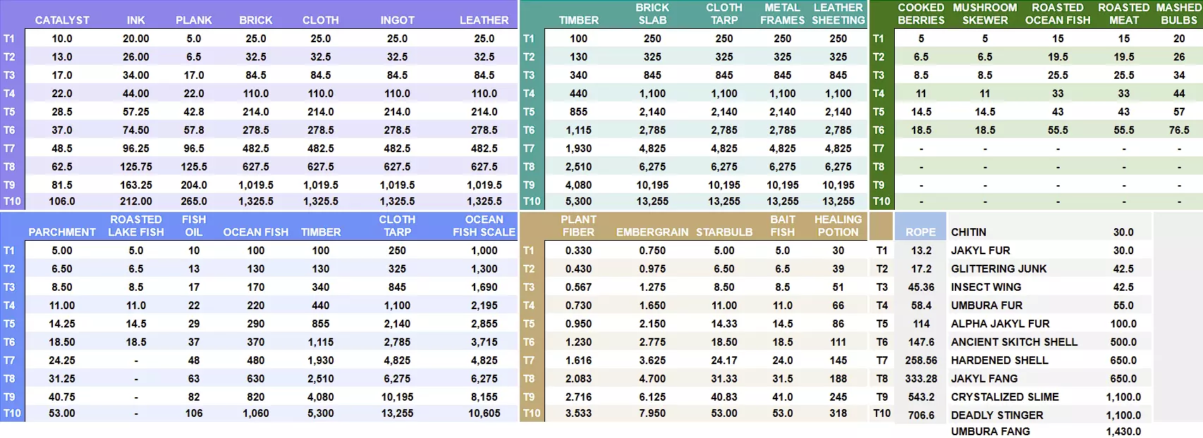 伦巴商人 - 商品定价 催化剂的定价有些奇怪,因为它的价格和一份鱼油完全相同。然而,制作一个催化剂却需要两份鱼油加上十颗种子……墨水的定价至少在鱼油成本上是合理的,但却没有包含颜料(五朵花)的费用。 等级 催化剂 墨水 木板 砖块 布料 锭 皮革 T1 10.0 20.00 5.0 25.0 25.0 25.0 25.0 T2 13.0 26.00 6.5 32.5 32.5 32.5 32.5 T3 17.0 34.00 17.0 84.5 84.5 84.5 84.5 T4 22.0 44.00 22.0 110.0 110.0 110.0 110.0 T5 28.5 57.25 42.8 214.0 214.0 214.0 214.0 T6 37.0 74.50 57.8 278.5 278.5 278.5 278.5 T7 48.5 96.25 96.5 482.5 482.5 482.5 482.5 T8 62.5 125.75 125.5 627.5 627.5 627.5 627.5 T9 81.5 163.25 204.0 1019.5 1019.5 1019.5 1019.5 T10 106.0 212.00 265.0 1325.5 1325.5 1325.5 1325.5 斯维姆-航海 自2025年10月2日起,你现在可以在海上找到漂浮物,这些漂浮物将提供航海经验。 等级 羊皮纸 烤湖鱼 鱼油 海鱼 木材 布料 防水布 海鱼鳞 T1 5.00 5.0 10 100 100 250 1,000 T2 6.50 6.5 13 130 130 325 1,300 T3 8.50 8.5 17 170 340 845 1,690 T4 11.00 11.0 22 220 440 1,100 2,195 T5 14.25 14.5 29 290 855 2,140 2,855 T6 18.50 18.5 37 370 1,115 2,785 3,715 T7 24.25 - 48 480 1,930 4,825 4,825 T8 31.25 - 63 630 2,510 6,275 6,275 T9 40.75 - 82 820 4,080 10,195 8,155 T10 53.00 - 106 1,060 5,300 13,255 10,605 海姆利希-烹饪 尽管T7-T10的食谱已于2025年9月18日添加到游戏中,但T7及以上的烹饪任务尚未添加。因此,目前我们还没有相关价格。等级 熟浆果 蘑菇串 烤海鱼 烤肉 球茎泥 T1 5 5 15 15 20 T2 6.5 6.5 19.5 19.5 26 T3 8.5 8.5 25.5 25.5 34 T4 11 11 33 33 44 T5 14.5 14.5 43 43 57 T6 18.5 18.5 55.5 55.5 76.5 T7 - - - - - T8 - - - - - T9 - - - - - T10 - - - - - Brico - 建造 T1/2级货物只需10个相同的基础材料。但从T3级开始,货物将需要两种不同类型的基础材料。例如:T3级布篷需要两个T2级皮革。T5级砖板需要两个T4级木板。等级 木材 砖块 石板 布料 防水布 金属框架 皮革板材 T1 100 250 250 250 250 T2 130 325 325 325 325 T3 340 845 845 845 845 T4 440 1,100 1,100 1,100 1,100 T5 855 2,140 2,140 2,140 2,140 T6 1,115 2,785 2,785 2,785 2,785 T7 1,930 4,825 4,825 4,825 4,825 T8 2,510 6,275 6,275 6,275 6,275 T9 4,080 10,195 10,195 10,195 10,195 T10 5,300 13,255 13,255 13,255 13,255 阿莱西 - 驯服 等级 植物纤维 余烬谷粒 星鳞果 诱饵鱼 治疗药水 T1 0.330 0.750 5.00 5.0 30 T2 0.430 0.975 6.50 6.5 39 T3 0.567 1.275 8.50 8.5 51 T4 0.730 1.650 11.00 11.0 66 T5 0.950 2.150 14.33 14.5 86 T6 1.230 2.775 18.50 18.5 111 T7 1.616 3.625 24.17 24.0 145 T8 2.083 4.700 31.33 31.5 188 T9 2.716 6.125 40.83 41.0 245 T10 3.533 7.950 53.00 53.0 318 兰帕特 - 猎杀者 甲壳质 300 杰克伊尔毛皮 30.0 闪光垃圾 42.5 昆虫翅膀 42.5 翁布拉毛皮 55.0 阿尔法杰克伊尔毛皮 100.0 远古斯基奇贝壳 500.0 硬化贝壳 650.0 杰克伊尔尖牙 650.0 结晶史莱姆 1,100.0 致命毒刺 1,100.0 翁布拉尖牙 1,430.0 装备、武器及工具 以下价格与市场价格差异极大,因为它们完全忽略稀有度,仅考虑单个材料成本。等级 T1 T2 T3 T4 T5 T6 T7 T8 T9 T10 头部 125 288 710 1,260 2,330 3,723 6,135 9,273 14,370 20,998 胸部 175 403 994 1,764 3,262 5,212 8,589 12,982 20,118 29,397 腿部 125 288 710 1,260 2,330 3,723 6,135 9,273 14,370 20,998 腰带 50 115 284 504 932 1,489 2,454 3,709 5,748 8,399 手套 25 58 142 252 466 745 1,227 1,855 2,874 4,200 鞋子 50 115 284 504 932 1,489 2,454 3,709 5,748 8,399 全套装备 550 1,265 3,124 5,544 10,252 16,379 26,994 40,799 63,228 92,389 武器 168.2 386.9 956.3 1,696.7 3,137.5 5,013.9 8,263.9 12,487.7 19,351.9 28,276.5 工具 186.4 428.8 1,060.52 1,881.3 3,478.9 5,560.7 9,165.8 13,848.4 21,459.8 31,356.0 鸣谢