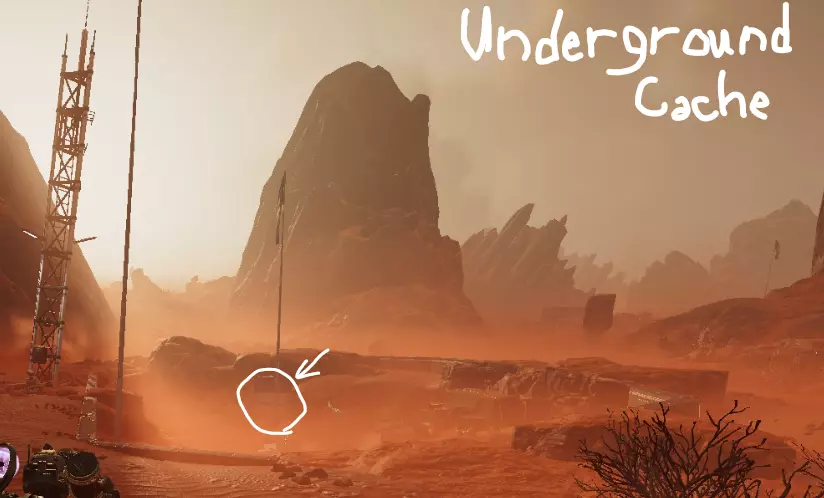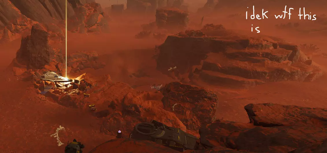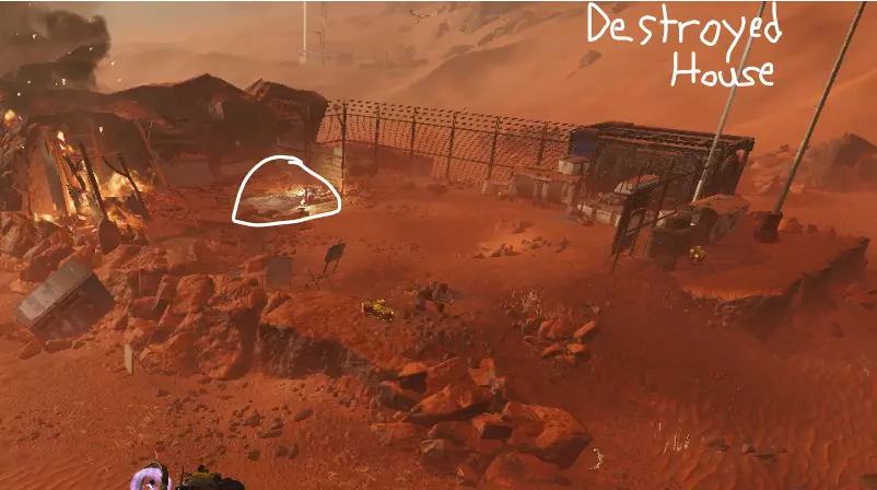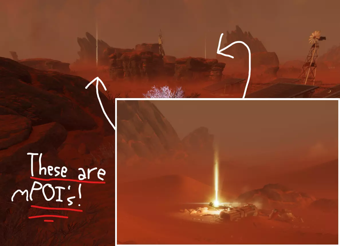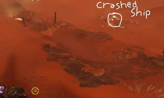 指南针上找不到任何东西?如果你抬头望向天空,有可能会看到坠毁的救援舱发出的发光光束。通常的策略是,如果你看到光束,就朝着它前进,并顺路清理掉其他小型兴趣点。下方是坠毁救援舱的参考示例。
