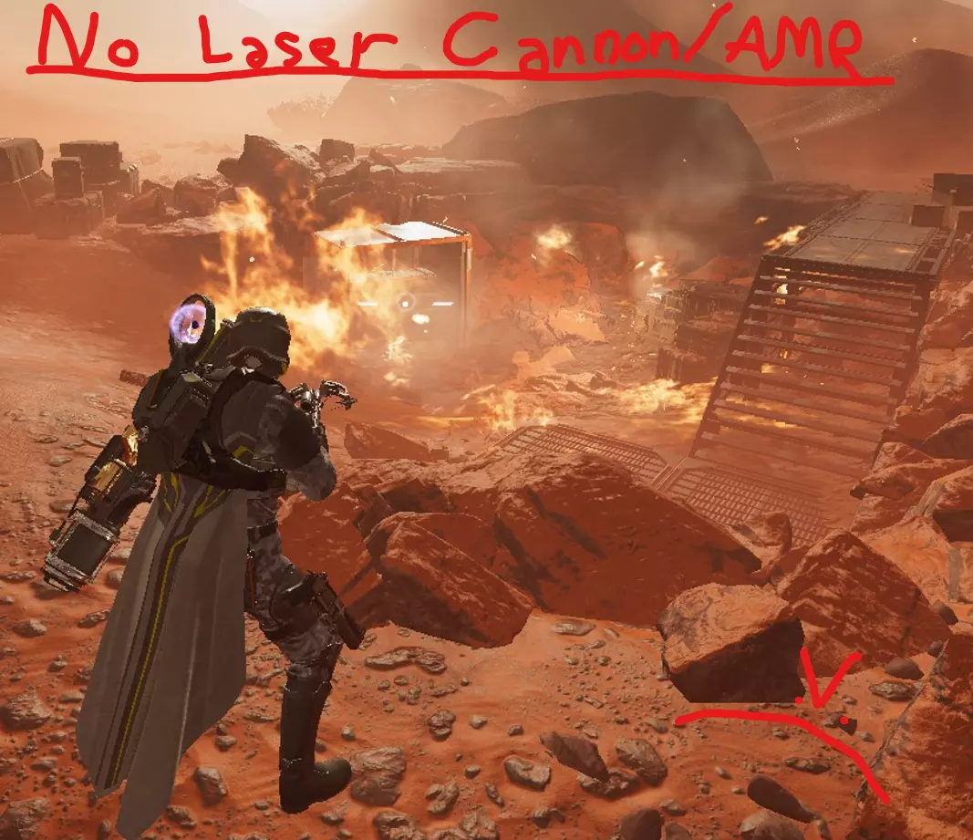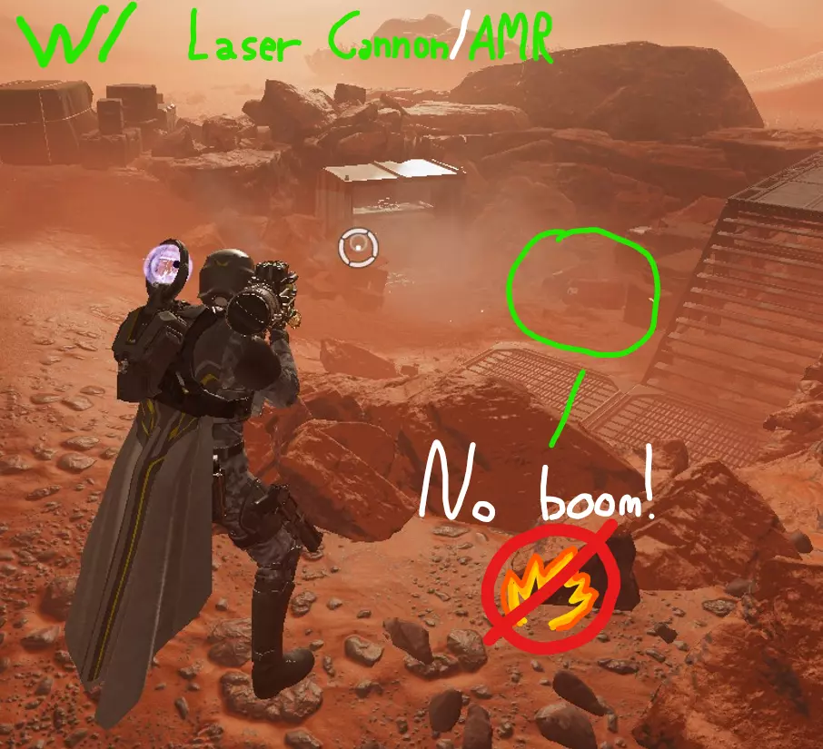 或者 APW-1反器材步枪/AMR(1级解锁,5000 requisition) 如果你无法使用激光炮,AMR仍然是一种有效的替代武器,可用于防止附近的桶爆炸。不过,使用激光炮会更好。更多解释详见“提示与重要须知”。