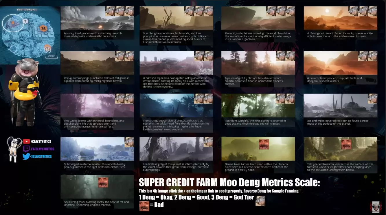 注意:这并非是在贬低SC-30开拓者侦察兵护甲,它确实具备侦察兵护甲的被动效果,而且也有其相关性。如果你没有ODST护甲,这款护甲对于刷SC值来说仍然是个不错的选择(因为它很轻)。 “种子刷取”SC值刷取方法 引用自random rustard:为什么没把种子滥用算进去?刷出或查找一些好的种子,能让你用一整个版本,而且确实有一些非常好的种子——你自己就能轻松找到约80SC值的种子,或者查找当前约120SC值的种子来使用,不过导入种子确实需要一些知识,但花几分钟在网上搜索一下就能学会。 这一点在指南的评论区中讨论过,最初曾作为建议提出,但“种子刷取”在很久以前就已被修复,现在不再有效。“刷种子”作为一种刷SC的方法,指的是反复游玩同一个任务/地图生成来获取奖励。但现在这种方法已经失效了,因为在任务中途崩溃或游戏关闭后收集到的任何物品都不会生效,也不会给予任何奖励。 Claysthetics 关于哪些生物群系和星球适合刷SC,这似乎是一个存在些许争议的话题,甚至有人制作了一份名为“Moo Deng SC farming Metrics Scale”的SC farming图片指南,由Claysthetics制作(还有他关于SC farming的原创Youtube视频)。 如果你不喜欢我推荐的星球,不妨参考这份指南!这是一个非常棒的工具,而最适合刷SC的星球可能因人而异!