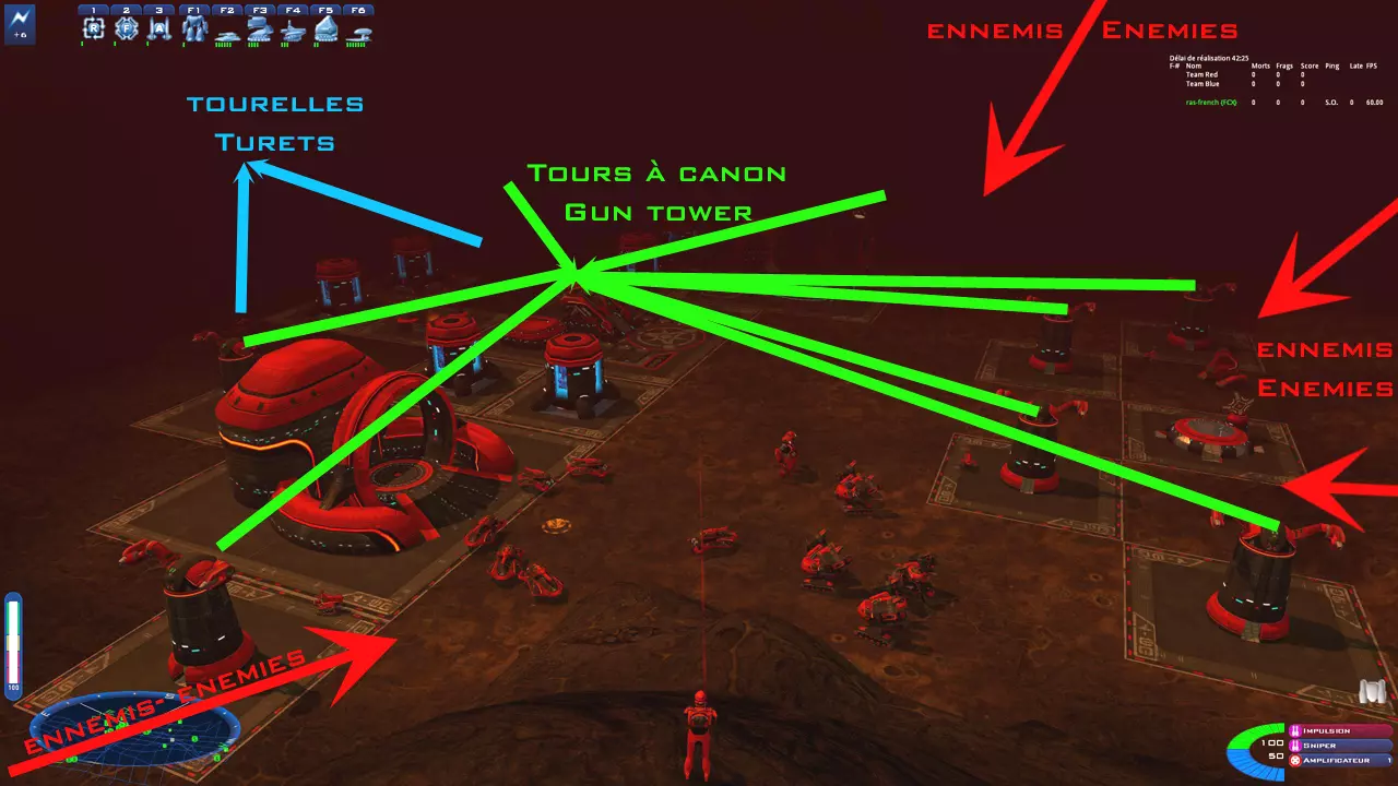 1. 红色标记处为敌人可能的来袭方向。 2. 绿色标记处为所有炮塔:基地后方2个,1个紧挨着工厂(同时保护一个改良油井),1个紧挨着维修区域。图片顶部中间位置,另有4个炮塔部署在右侧可能的来袭方向前方,同时保护附近的油井。这种布局下,敌人会遭受交叉火力攻击,效果非常显著,因为炮塔之间不会相互干扰。 3. 蓝色标记处为2个部署在后方的炮塔,用于应对可能渗透进来的敌人。 4. 可以注意到能量站以2×2的方式分散布置,并且前方有6个。 5. 工厂和建筑物前方有足够空间,确保通行顺畅。 6. 观察细致的人会发现炮塔底部有几辆维修车。7. 底部维修区域采用“开放式”布局,便于部队进出维修。关于这一点,记得在维修区域中央放置一个导航信标,这对于将受损部队派往那里非常有用。 8. 所有这些都能为你节省大量原本会花费的时间:你将变得更高效! 9. 对抗赛昂势力时,你会遇到弓箭手。它们经常降落在周围的高地上。 一个非常有效的解决方案是在基地周围的高地上部署炮塔。这样一来,要么你的炮塔会摧毁弓箭手,要么这些弓箭手会降落在更远的地方,有时甚至远到无法对你进行射击。 唯一的条件是:这些高地的坡度不能太陡,以便炮塔能够攀爬上去。 各种战略建议。对于【后裔】派系,情况基本相同,只是能量会在建筑建造过程中整合进去。 通过尝试所有派系,你会自己发现这一点;这能让你改变游戏风格。 新玩家们,欢迎来到【战斗区域:战斗指挥官】,期待在多人游戏中与你们相见。“游戏开始的前5分钟通常决定了最终结果。赢家往往是那些在前5分钟内充分利用时间的玩家。” • 在这款战略游戏中,你初始拥有1个回收厂和40资源单位(废料)。立即建造2个拾荒者,收集资源。你可以派遣其中1个拾荒者去收集碎片,但当碎片耗尽时别忘了将其部署回来。 • 资源运作方式:屏幕左侧的进度条显示资源情况。 • 绿色部分代表回收厂的40存储单位,每3秒产生1单位资源。 • 黄色部分代表20单位资源的萃取器,每秒产生1单位资源。 • 红色部分代表20单位资源的改良萃取器,每秒产生2单位资源。你的萃取速度与萃取器数量无关,而取决于你的存储量。确实,如果你想建造一辆突击坦克(70碎片),同时拥有2个采集器和1个回收器,那么前40个碎片会很快集齐(40秒,如果你的采集器已升级则只需20秒),而剩下的30个碎片则需要依靠回收器,这将花费90秒!!! • 因此,只建造你的生产能力合理允许的单位。 • 游戏初期,拥有2个采集器时,建造一些轻型炮塔来保护资源点。 • 迅速部署第三个采集器并制造一个建造单位。 • 拥有三个采集器后(通常每张地图有7个资源点,所以游戏初期如果你想顺利发展,需要3到4个采集器),建造一座能量站,并派遣你的建造单位前往最近的资源点。当他前往那里时,建造第二个建造单位来扩建你的基地,并用炮塔保护基地。 • 如果你资源仍然不足,一个技巧是加强基地防御并等待敌人进攻。每艘被摧毁的舰船都会掉落资源,你的拾荒单位会收集这些资源。 • 在每个资源点附近,建造一个中继碉堡和两到三个炮塔,从而在游戏初期确保该区域安全。在炮塔旁配备一辆维修车也非常有用。 不要忘记建造足够的发电厂为所有设施供电。 • 在你的第一个建造单位移动期间扩建基地(不要让资源碎片不必要地堆积!)。同时建造维修车,并至少派遣一辆到每个炮塔,以便在攻击期间进行维修。• 一旦建造好军械库,进入你的工厂和回收厂。 选择房间后部的光板,然后选择你想要升级的每个单位。 例如,为侦察机配备机枪,为轻型坦克配备机枪+SP-Stab…… 这样,每个建造的单位都会采用此配置,但成本会略高一些。 • 如果你在游戏开始时就部署了炮塔,它们会采用标准配置(迷你枪)。一旦拥有军械库,可为这些炮塔制造机枪,操作如下:3(军械库)==> 1(步枪)==> 4(机枪),然后按空格键瞄准炮塔。 机枪会直接安装到所选炮塔上。 你也可以通过进入中继碉堡进行此操作,这在你的单位距离过远时很有用。• 当你用加农炮塔保护自己的资源点时,可以将淘汰的轻型炮塔部署到无保护的地点或山丘上,以防御弓箭手。 合理布置炮塔,确保没有盲区:聪明的对手会利用炮塔的掩护绕到你的掠夺者身后,从而在不被攻击的情况下将其摧毁。 • 游戏初期不要攻击对手的基地,这纯粹是浪费时间,最有效的做法是摧毁他的水井,剥夺其资源。 • 当你建立起稳固的基础后,再考虑突破对方的防御。 游戏初期,最有效的单位是迫击炮摩托! 当拥有45个单位时,你可以组建不间断的迫击炮摩托突击波。它们可以在不被击中的情况下摧毁轻型炮塔,你可以派出5到6辆迫击炮摩托对抗炮塔。 - 迫击炮摩托会有损失,但以它们的造价而言不成问题,炮塔也会被摧毁。此外,如果你已派突袭者前往那里,它们会回收被摧毁单位掉落的资源。 - 清理据点时,务必让建造者在附近,这样你就能立即占领该区域。 - 游戏进入后期,摧毁加农炮塔的终极武器是突击坦克。 建造4到5辆突击坦克,并配备维修车,以便在它们受到攻击时进行修理。 突击坦克的射程比炮塔更远,因此可以安全且快速地将其摧毁。你也可以让它们留在原地防守该区域,同时等待你的建造者。 • 记住,如果你在前线附近,千万不要静止不动,否则你会成为狙击手的 easy target。 • 如果敌方飞行员弹射到你的基地,要在他们的着陆点将