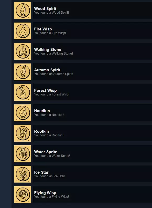 你可以通过探索世界来发现元素精灵。你的等级越高,通过完成任务(或者只是待着不动)解锁的地点就越多。因此,随着游戏的进行,你将能够接触到更多的元素精灵。 有些元素精灵很容易被发现。 有些会稍微隐藏起来。 有些并非一直出现。 有些会在特定天气条件下出现。我发现其中大多数都很容易找到,但我知道并非所有人都善于观察。 :) 元素灵是按从最低到最高等级排序的——这样你就能轻松检查是否遗漏了其中任何一个! 成就 它们都非常简单。现在有很多人在使用这款游戏/工具,他们可能不太熟悉Steam,在游戏库显示中,有些游戏可能会显示为【隐藏】状态……所以为了方便参考,我在这里做一个简要说明: 与活动相关 欢迎来到奥塔克:你来到奥塔克开始学习。