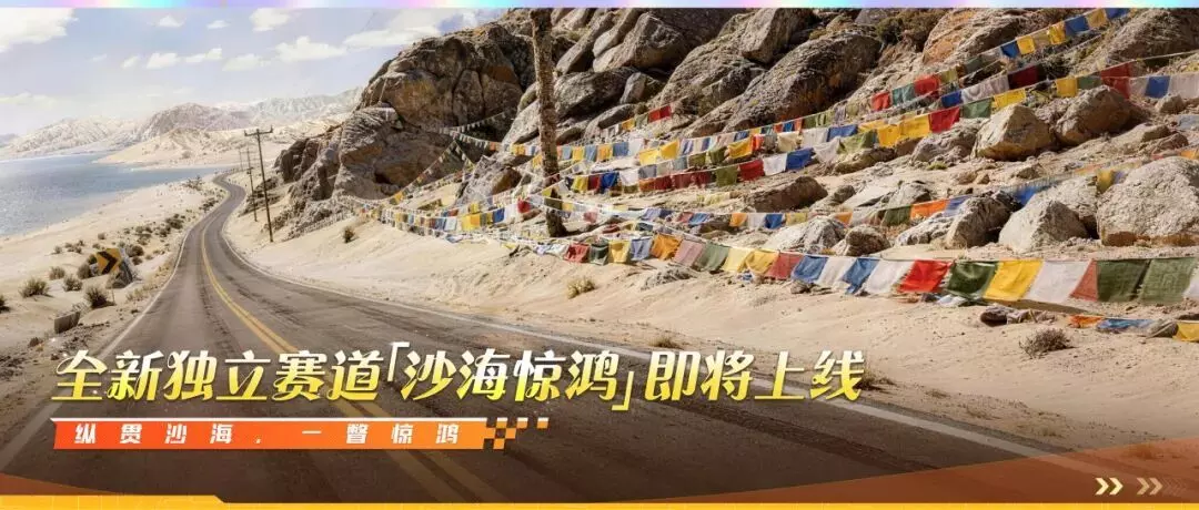 全新独立场景赛道“沙海惊鸿”3月19日正式上线!沙海之下埋藏千年洞窟,闯入其中,车灯骤然划亮满壁飞天壁画;紧贴暗红色崖壁高速漂移,万千彩色旗阵在大漠狂风中猎猎作响;荒漠尽头,一片蔚蓝湖泊成为惊鸿一瞥的句点。