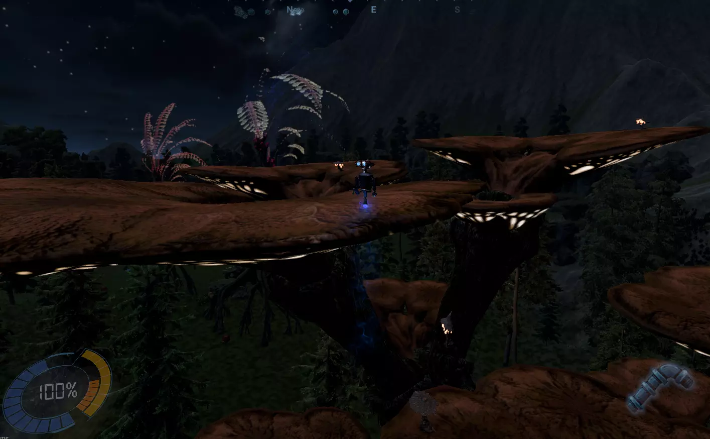 这个确实挺酷的,尤其是像我一样在晚上这么做的时候。在进入沙漠前,先爬上蘑菇树。 在推进主线剧情前,你会遇到一棵巨大的蘑菇树。为了完成全程使用少于10单位燃料的成就,我建议为此单独创建一个存档,以减少燃料消耗。 爬上这棵树其实没那么难。可能需要多试几次,但你总能找到方法。蘑菇本身以及看起来可以站立的树干部分,都可以用来站立,让你的推进器燃料重新充满。山顶见!