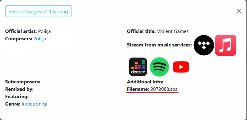 将你的【输出名称】.sps文件重命名为歌曲信息中的文件名。(我想替换Poliça - Violent Games,所以我的新文件名会是2072088.sps) 现在打开游戏文件夹: