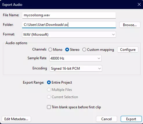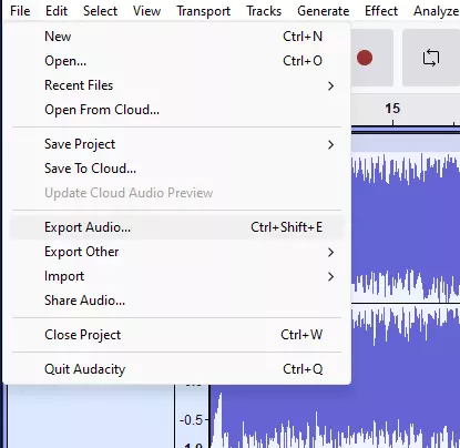 然后,按下Ctrl+Esc+E(或文件->导出音频)