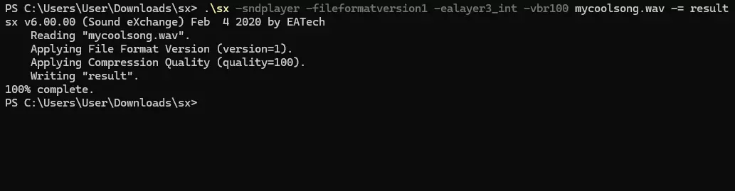 在终端中输入以下命令: . sx -sndplayer -fileformatversion1 -ealayer3_int -vbr100 【音频文件名】 -= 【输出文件名】 将【音频文件名】和【输出文件名】分别替换为你的音频文件名以及输出的.SPS文件名。 示例:. sx -sndplayer -fileformatversion1 -ealayer3_int -vbr100 mycoolsong.wav -= result 如果操作正确,终端中会显示以下内容: