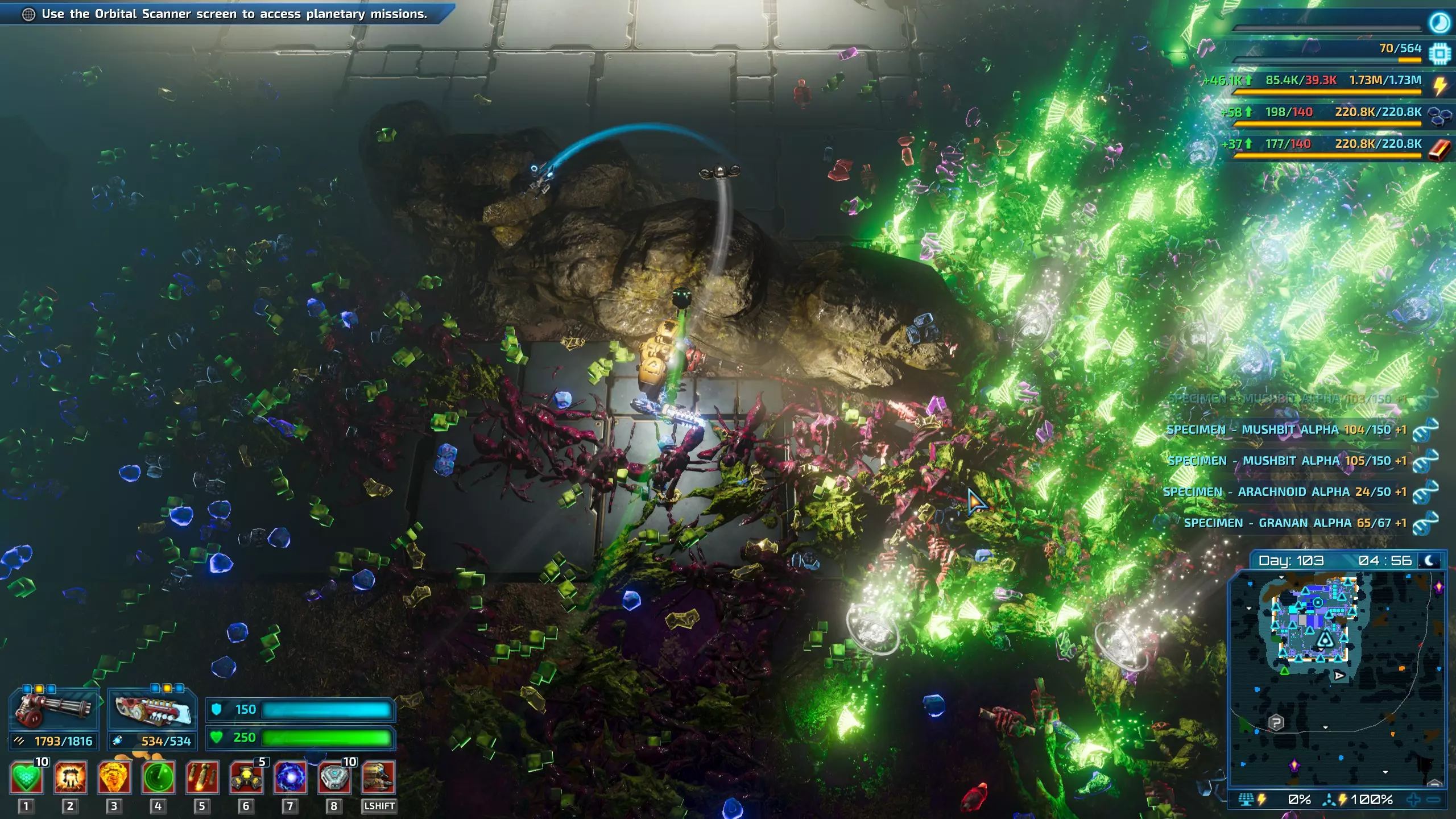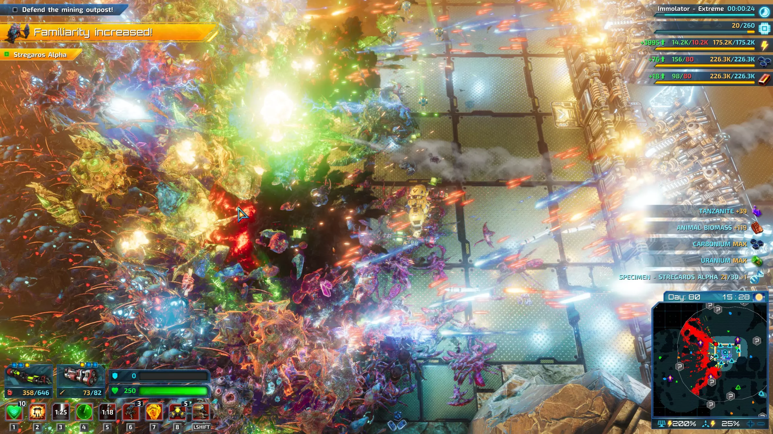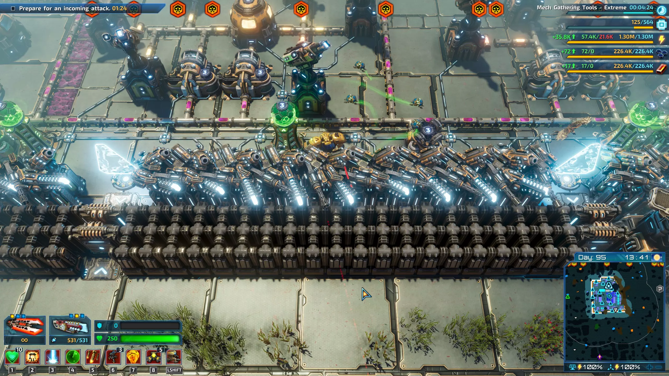图8:采矿前哨站的防御塔与已完成目标的防御。我正站在防御塔防线中间,以将一些怪物从角落引开。 提示:每个采矿前哨站通常配备4座塔防弹药工厂。这有助于应对基地的大规模攻击,防止弹药不足。 提示:我发现以下防御塔毫无用处: 轨道炮和激光炮消耗能量过多,无法大规模使用。 攻击无人机塔和布雷塔速度慢且体积庞大。 火焰喷射器、冲击波等短程防御塔并非必需,因为怪物通常不会足够靠近。在游戏后期或终局阶段,防御塔/墙壁受到的伤害通常来自像纳格拉克斯终极体这样的远程怪物。在500%残酷难度下,敌人波次规模极大,防御塔需要花费大量时间处理近距离的小怪,这就给了纳格拉克足够的时间向我的防御塔投掷炮弹,直接绕过了墙壁。非常烦人。 提示:面对500%的敌人时,刷模组会变得很容易。在你的机甲上装备能量传感器,然后到防御塔前方去战斗。