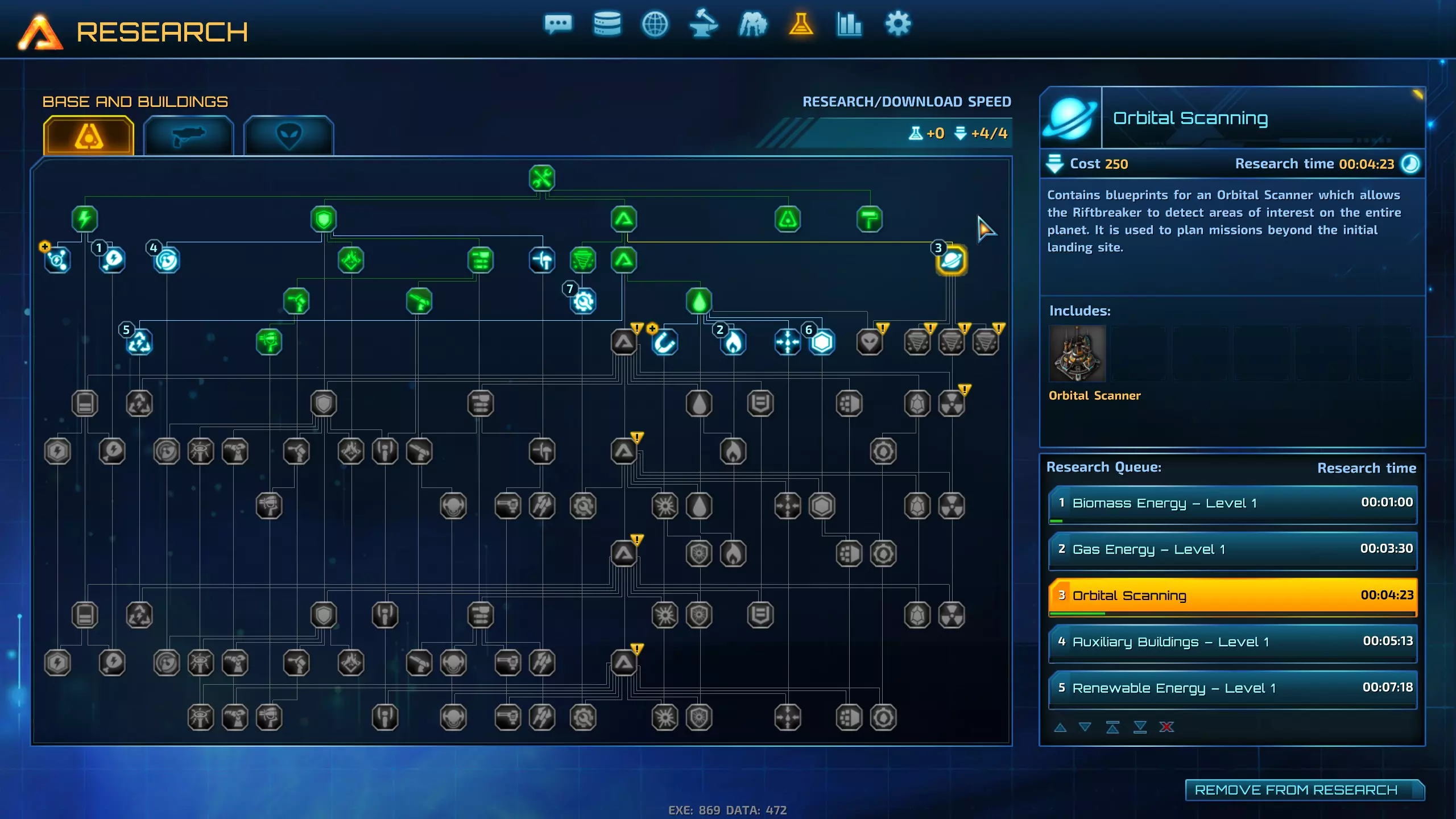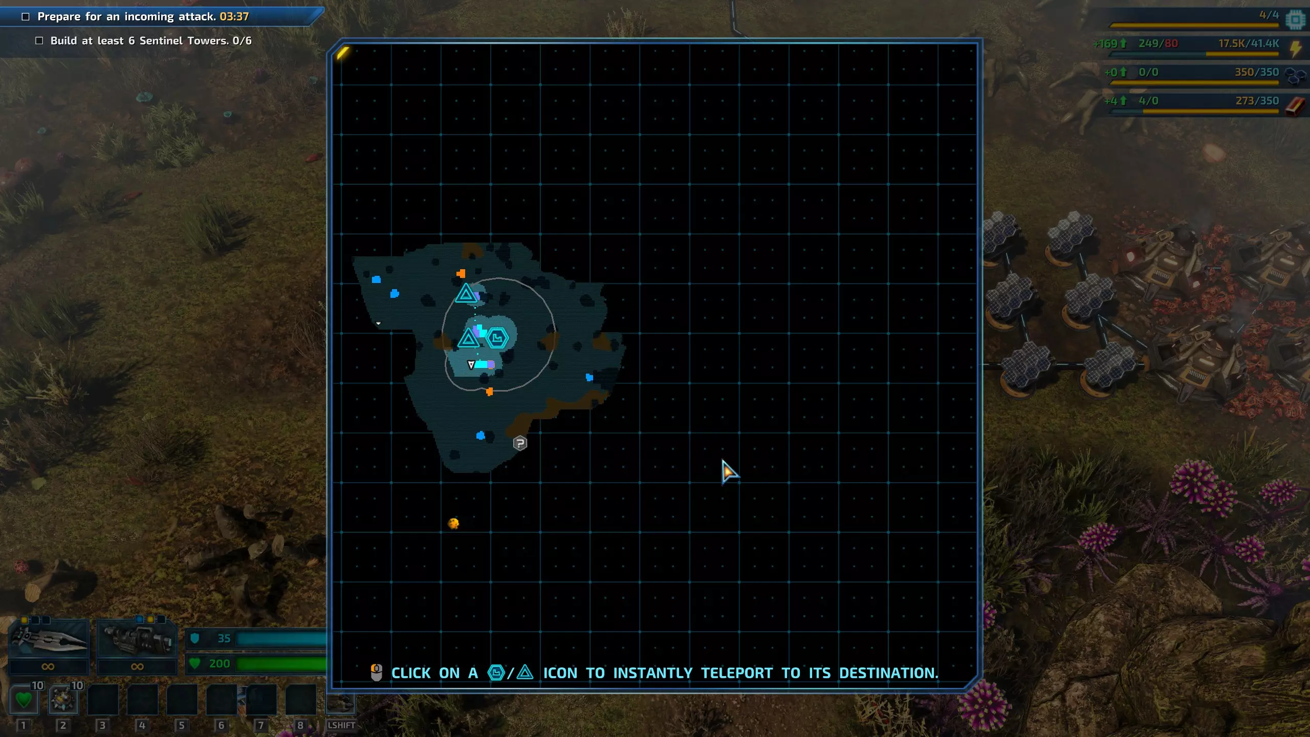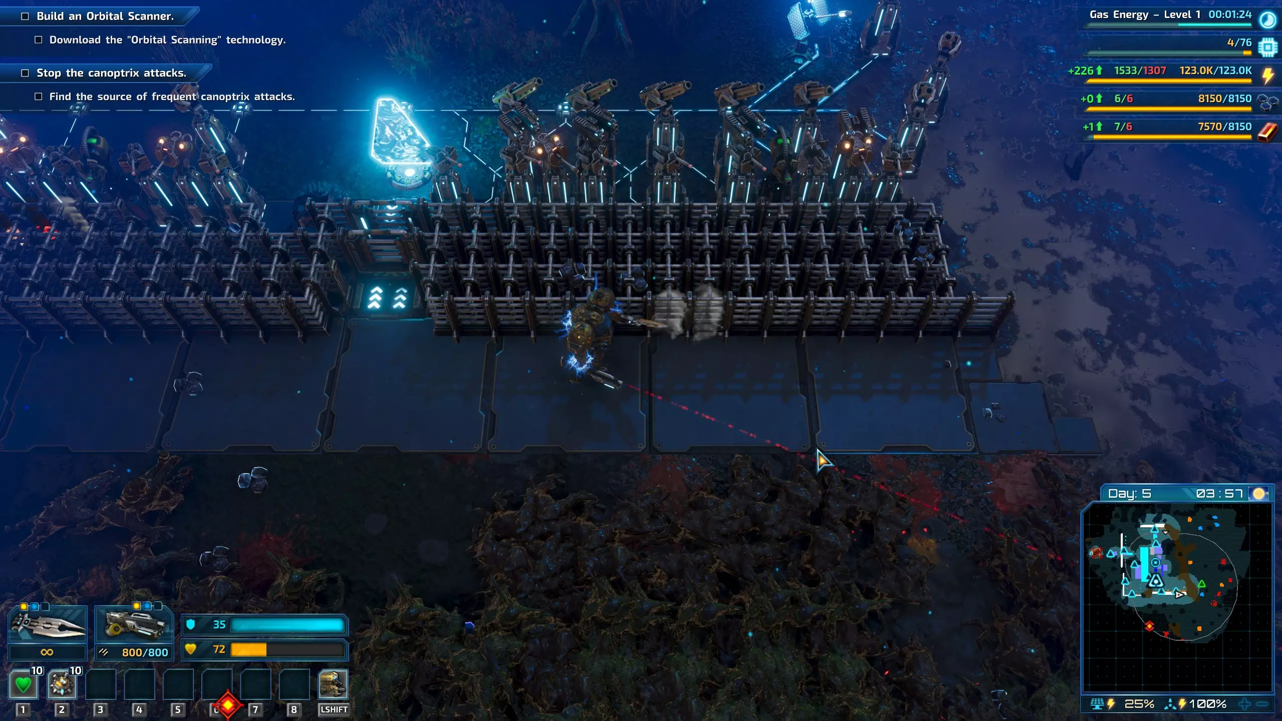 图3:在下一波攻击前及时研发的关键防御塔。在这个例子中,我研发了火焰陷阱,但发现它们并不是很有用。在后续的游戏流程中,我就跳过了火焰陷阱的研发。 第五天 1) 一旦解锁钴处理技术,攻击波就会为你提供大量的钴。有一次,我在遭受攻击后收集到了500钴(足够建造轨道扫描仪),但此时游戏还未标记出总部地图中唯一的钴矿节点位置(通常在地图的边缘附近)。因此,我不得不重新加载到攻击前的存档,不再收集那么多钴(这样我就能在小地图上知道钴矿节点的位置——一旦你获得500钴,节点标记就会消失)。这里的目标是获取至少1000钴,稍后你就会明白原因。500钴是用于建造轨道扫描仪的。2) 一旦拥有气体能源1,在淤泥上建造燃气发电站(如果运气好能找到的话),或者在泥地上建造燃气发电站,并使用水过滤器为生物堆肥器供能(提示:每个生物堆肥器仅需10单位水,因此可以与研究实验室共用同一个水过滤器)。每2个生物堆肥器可为1个燃气发电站供能,该发电站能产生500能源,但每秒消耗2片树叶。这就是为什么在探索时四处砍树很有用。 3) 不要将所有额外的新电力都用于人工智能中心和塔楼。保留500能源或1个燃气发电站给实验室(初期只需250能源,但很快就需要升级)。也要为实验室准备一个水过滤器。 4) 在下午晚些时候,将周期性攻击波切换为总部升级攻击波。研究应进行到第12项。第13项需要很长时间且为可选项目,但它能使所有碳铁工厂的产量翻倍,这意味着我无需在总部外进行扩建,因为矿物消耗速度不会很快了。 5) 在攻击波来袭前完成总部升级。研究总部4级。 6) 此次攻击同样包含蟹蛛和蛛形生物,但这次还会有坦克般的锤角兽。它们对酸系攻击较为脆弱。因此建造一些酸液喷射塔。如果可以的话,再增加1-2排墙壁,或许再添几座哨兵塔。无需建造过多的火炮以及火焰/酸液塔,因为即便有6座弹药工厂,它们的弹药也会很快耗尽。