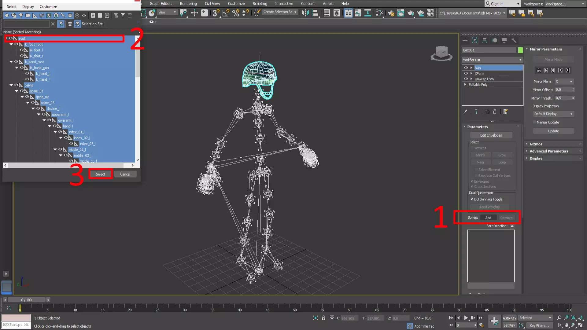 使用Skin修改器将模型绑定到骨骼。 1. 选择Bones ADD。 2. 选择Root值(仅选择此值)并按CTRL+A以选择所有骨骼。 3. 点击Select。