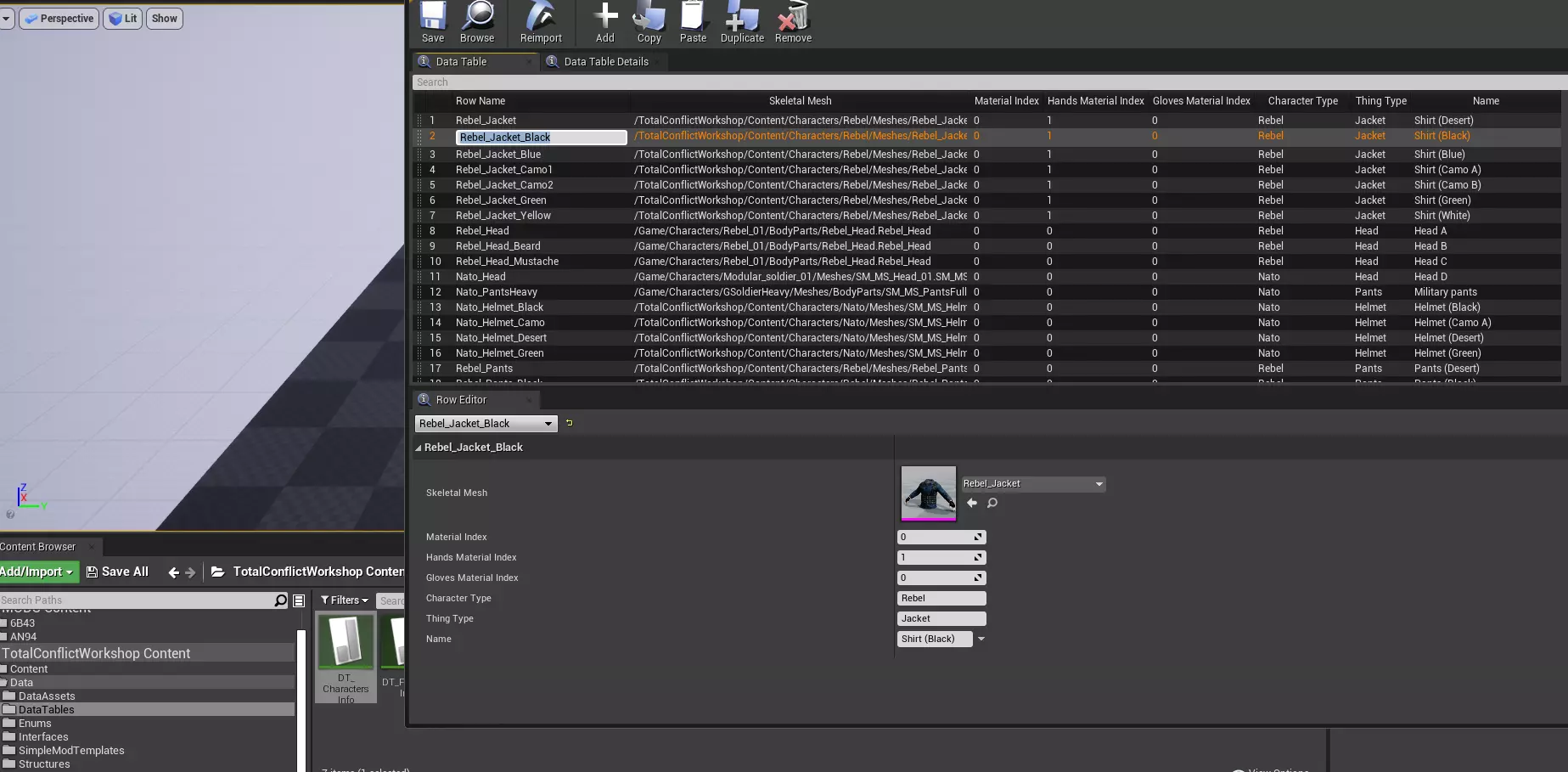 在BP_CharacterModelData中指定要替换的模型(行名称,数据位于TotalConflictWorkshop插件的DataTable文件中)以及要替换为的骨骼网格体模型。