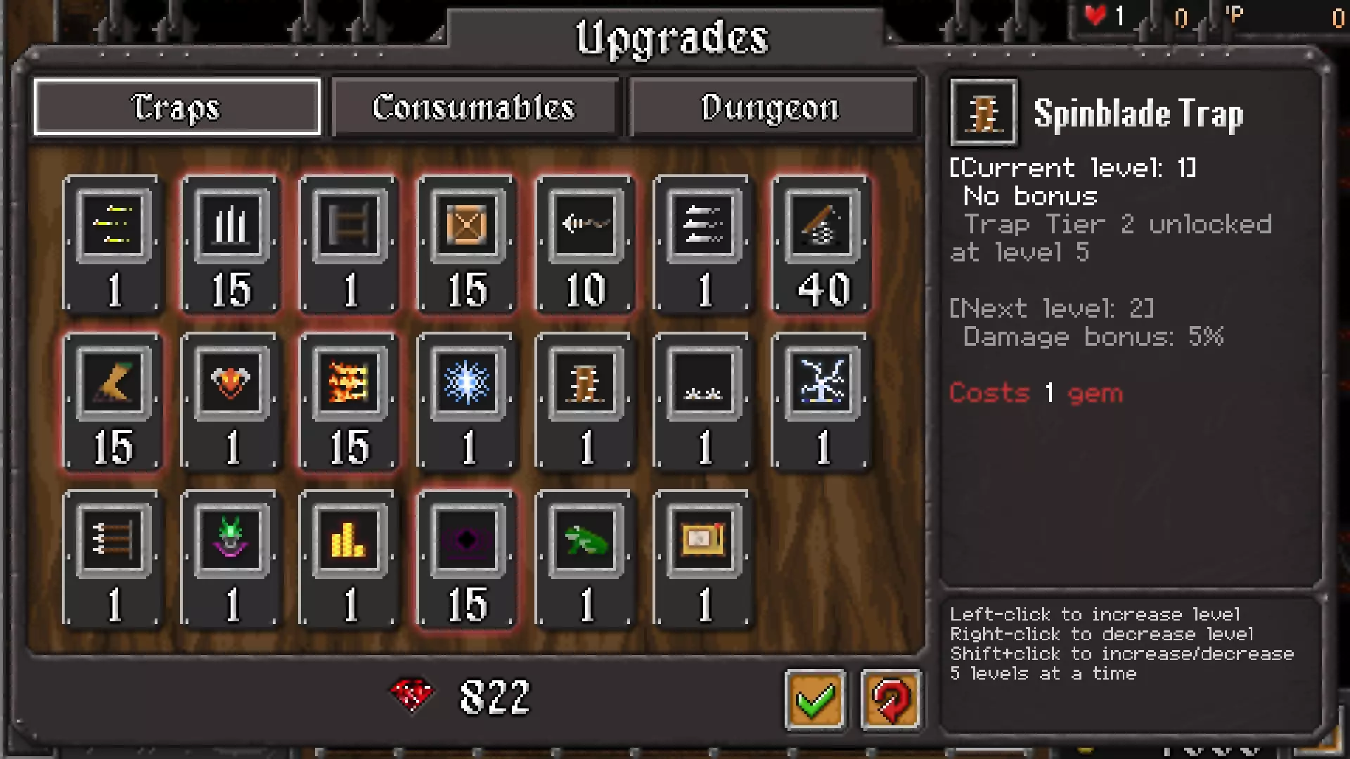 我们至少需要10级的【鱼叉陷阱】,因为我们不需要4级陷阱。 1级的【推进陷阱】就足够了。 必须升到15级的陷阱有【黑洞陷阱】、【黏液陷阱】、【路障】和【尖刺陷阱】。 建议【弹簧陷阱】至少升到40级。 【地狱陷阱】完全可选。 最后一个陷阱选择由你决定。 我的初始奖励金币等级为15级。 选择你最喜欢的消耗品即可,我选了【诱捕】。 第1波