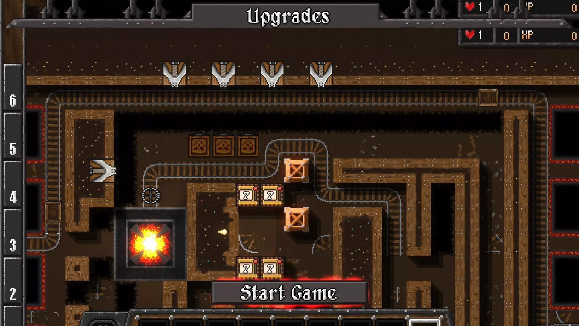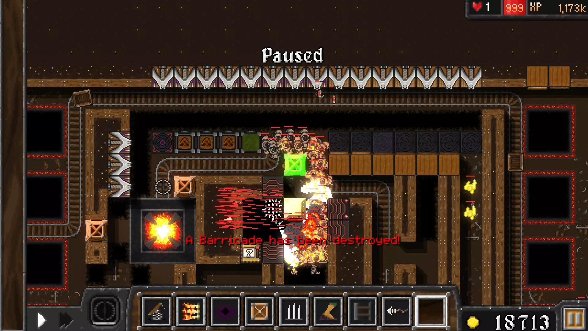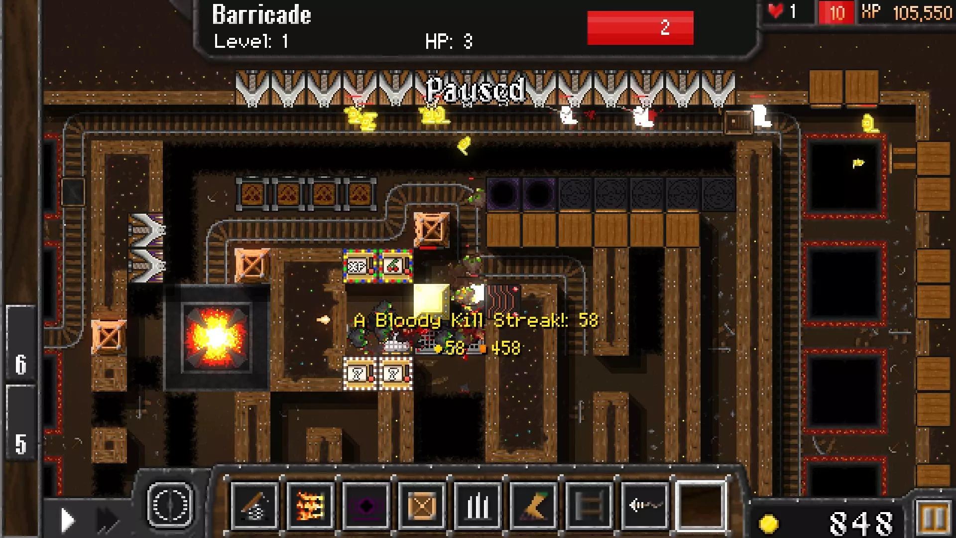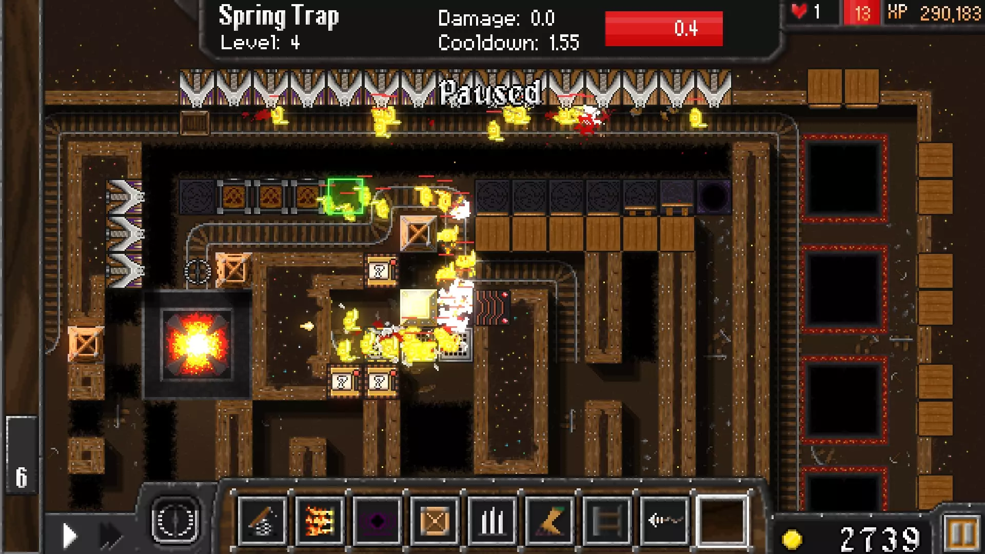 到第2波时,你应该已经非常富有了。再放置一个弹簧陷阱,并将所有弹簧陷阱升级到3级,最右侧的那个升级到4级。我之前忘了这一点,直到很久以后才这么做。在传送门左侧放置路障,在右侧大量布置推击陷阱。