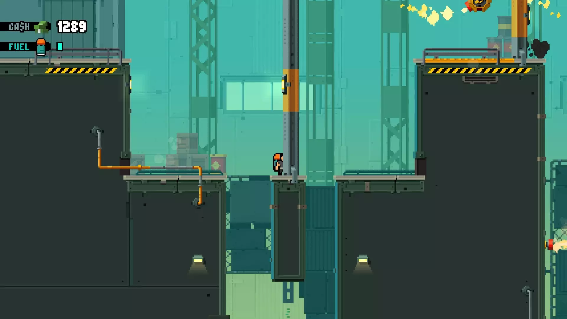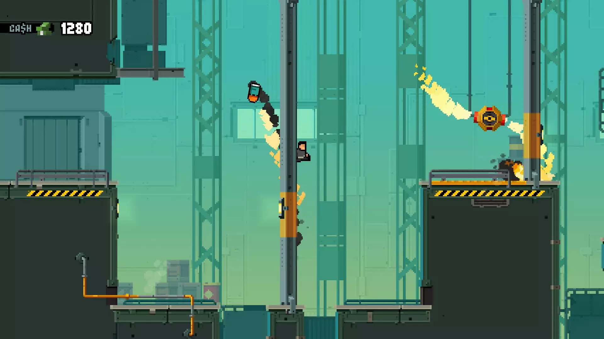 摧毁墙壁后,从下方获取喷气背包。按照截图所示的位置进行摆放,让喷气背包落在平台上方并爆炸。 要到达平台,你需要获取旋转火焰喷射器旁边的第二个喷气背包。注意:你至少需要3次充能才能通过。飞过旋转火焰喷射器,穿过墙壁上的突破口。