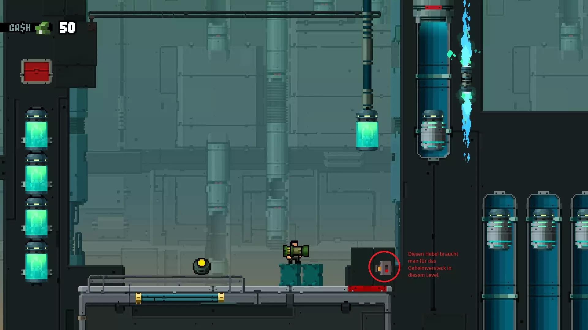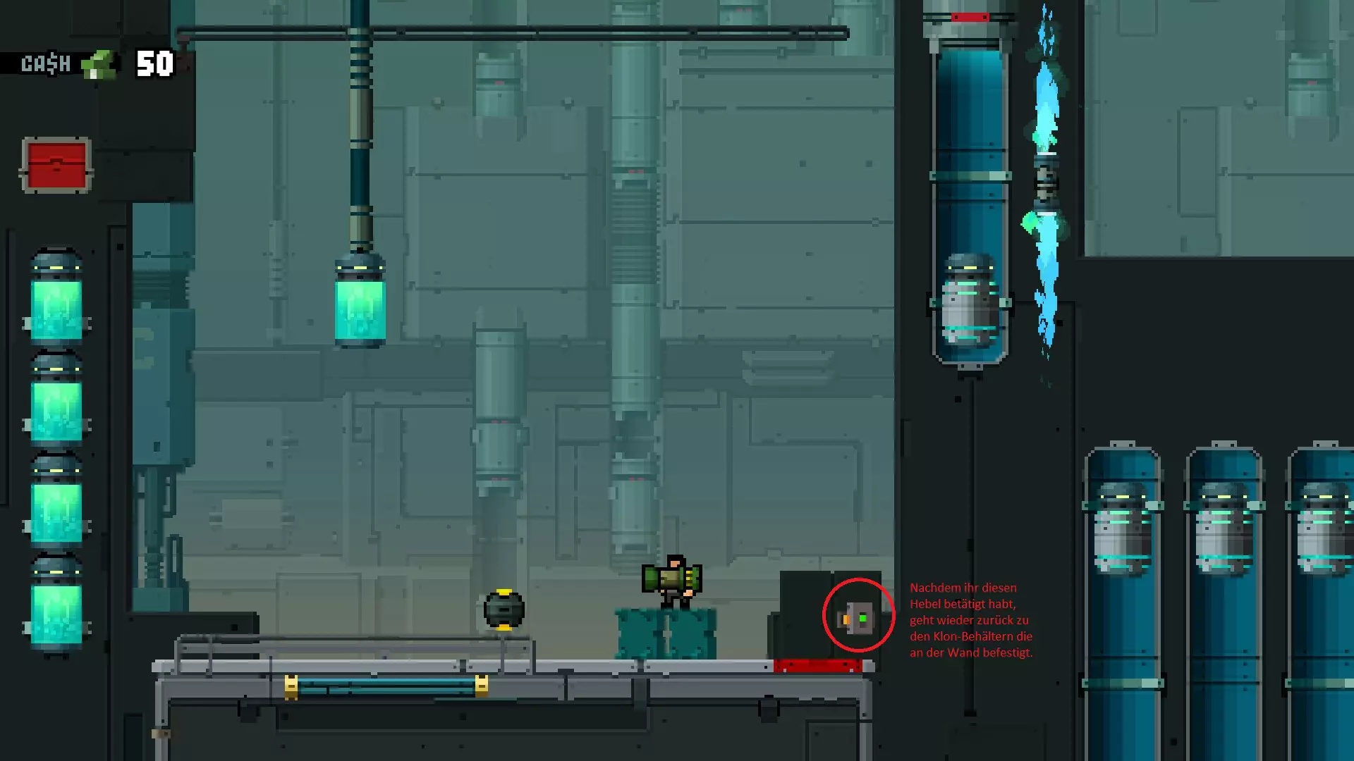 【Kill me ... PLZ】 该成就在关卡“Inside”中获取。 它位于有烟雾冒出的克隆容器处。 要开启这个隐藏区域并进入,你需要到后面扳动开关,然后再回到克隆容器处,具体位置如截图所示。