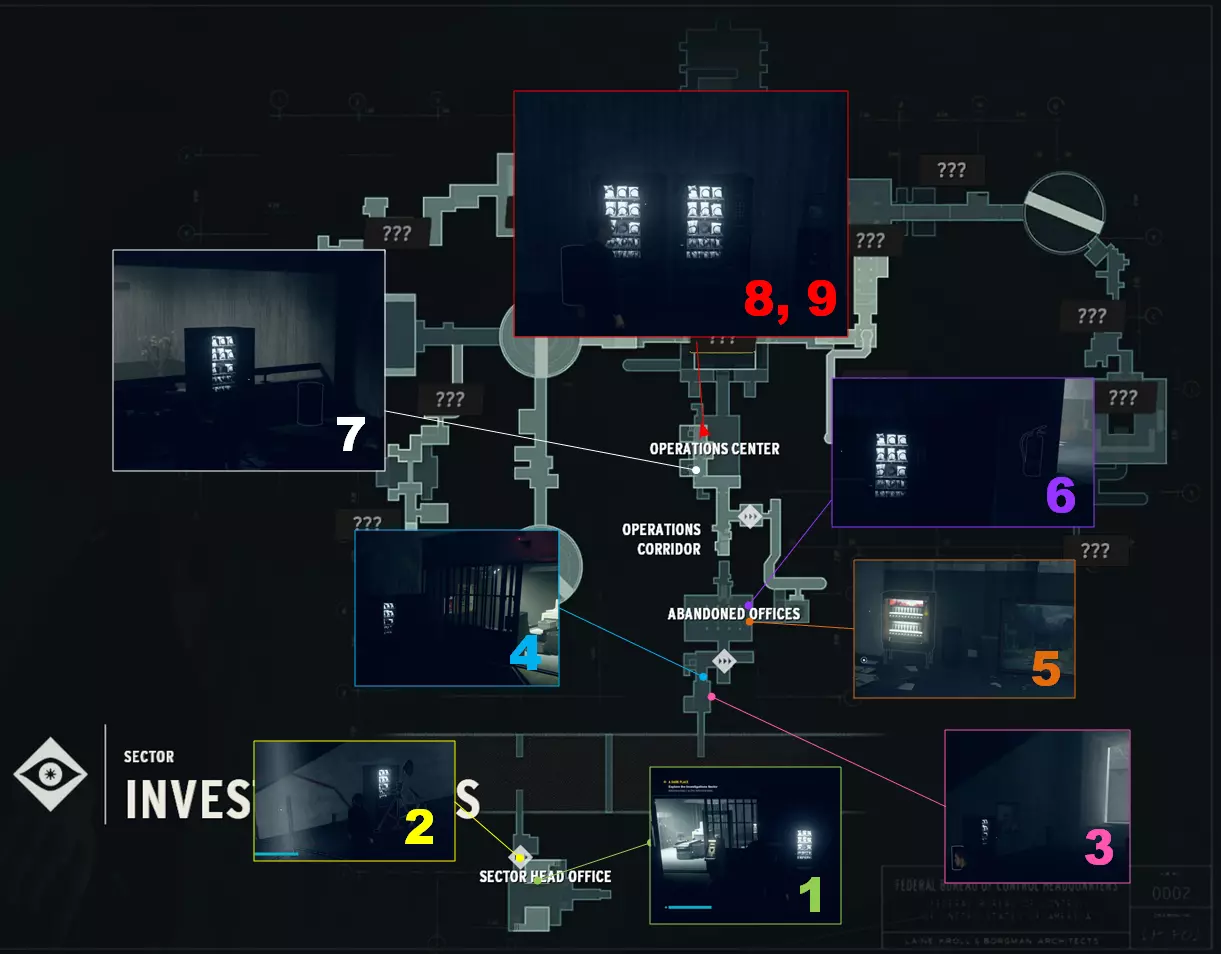 就我遇到的情况而言,3号被附身了,现在它正朝着防火带移动。 7号、8号和9号在暗室的二楼,就在行动走廊控制点的正后方。