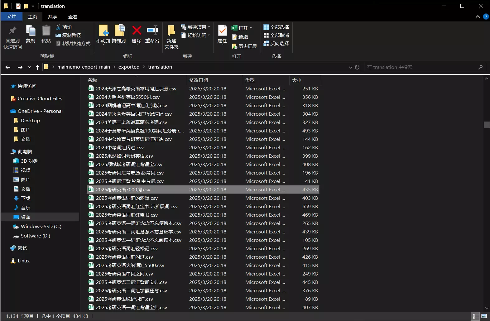 下载全部项目后,在文件夹路径【maimemo-export-main exported translation】中就是所有的中英对照词书了,本篇教程选择的是其中的【2025考研英语7000词.csv】。
