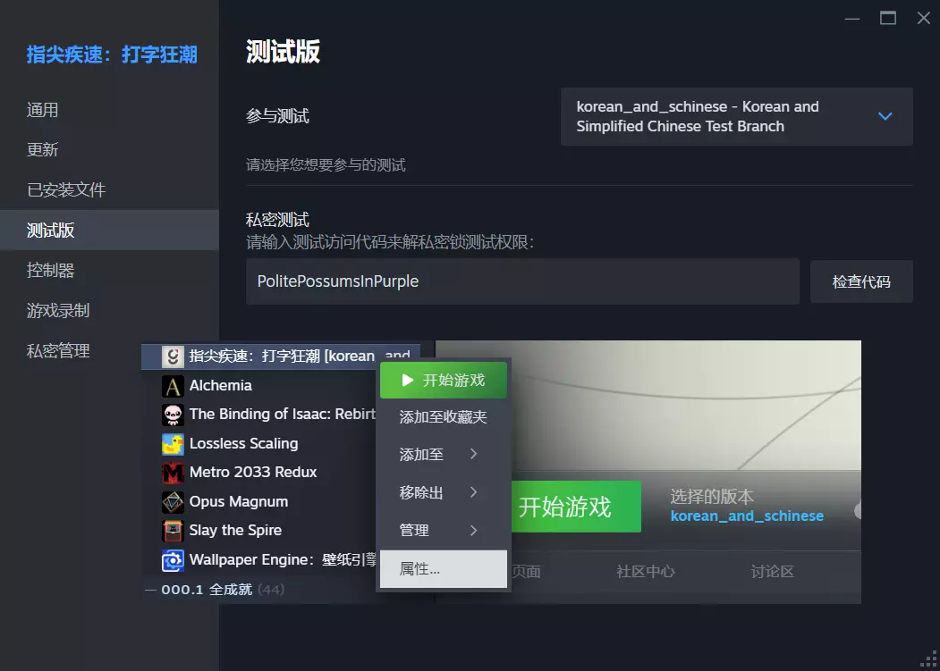三、中文测试版本[正式版已更新中文此步跳过] 若已经为测试版的跳过该步骤。在steam游戏库右键点击游戏→选择"属性"。 点击左侧"测试版"→在"私密测试"中输入代码→点击右侧"检查代码"。