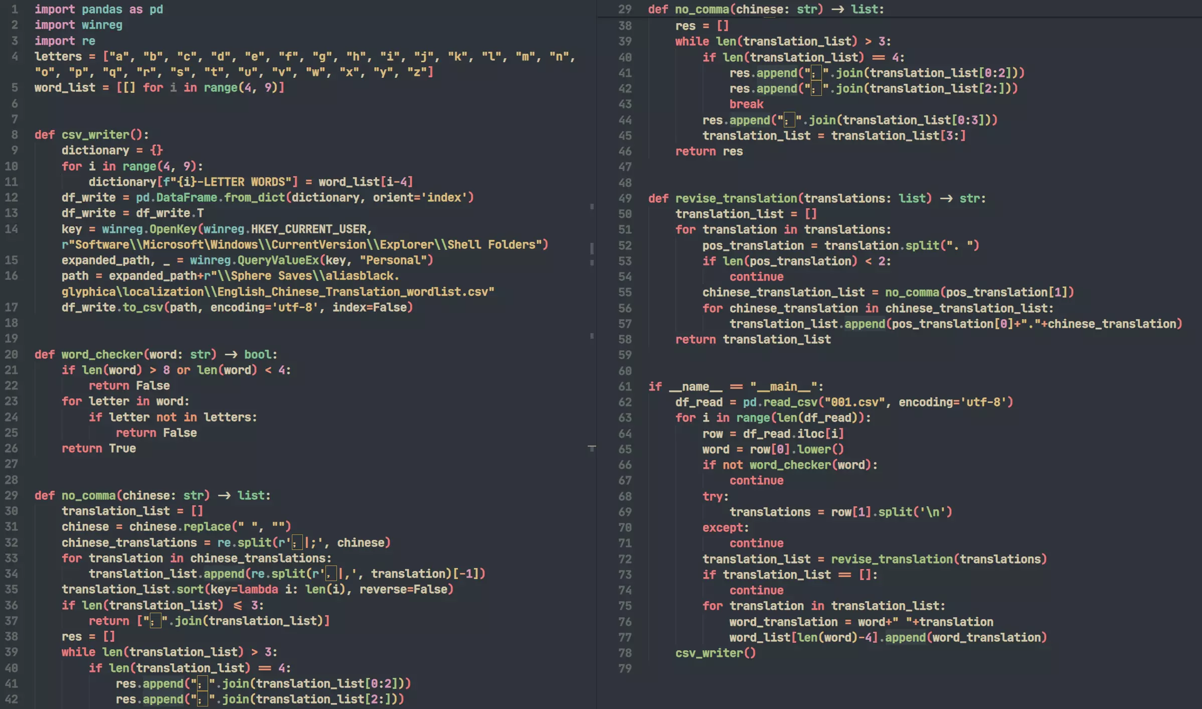 二、转换词书格式 游戏支持的单词长度为4-8,且单词中只能出现小写字母。由于词书中存在小部分不规范单词,代码会过滤掉一部分单词。 在桌面新建一个文件夹,将挑选的词书复制进去,并在同一文件夹下新建一个Python文件,输入以下内容并运行。 注:no_comma函数中黄色方框标注的标点为中文标点。 注:代码第62行将"001"替换为选择词书的文件名。