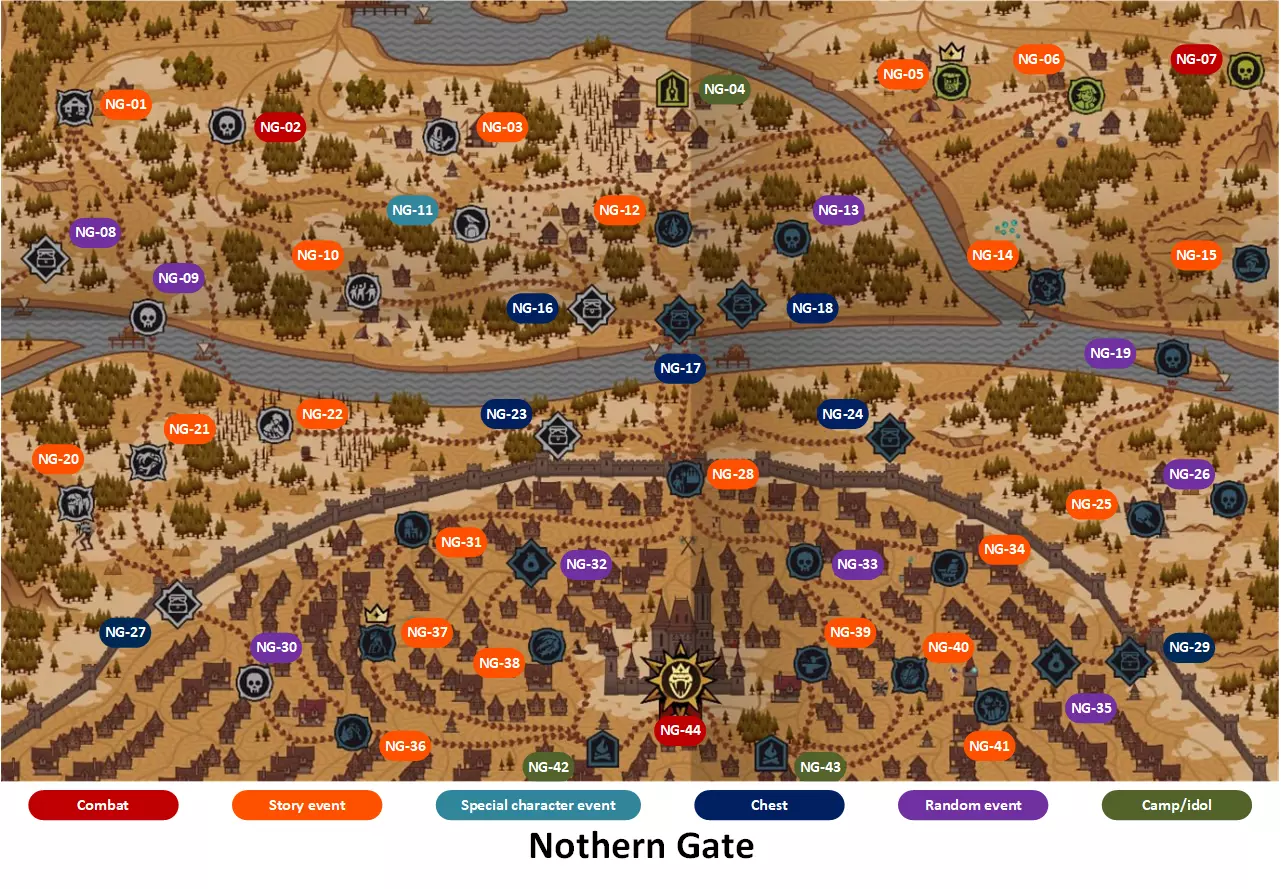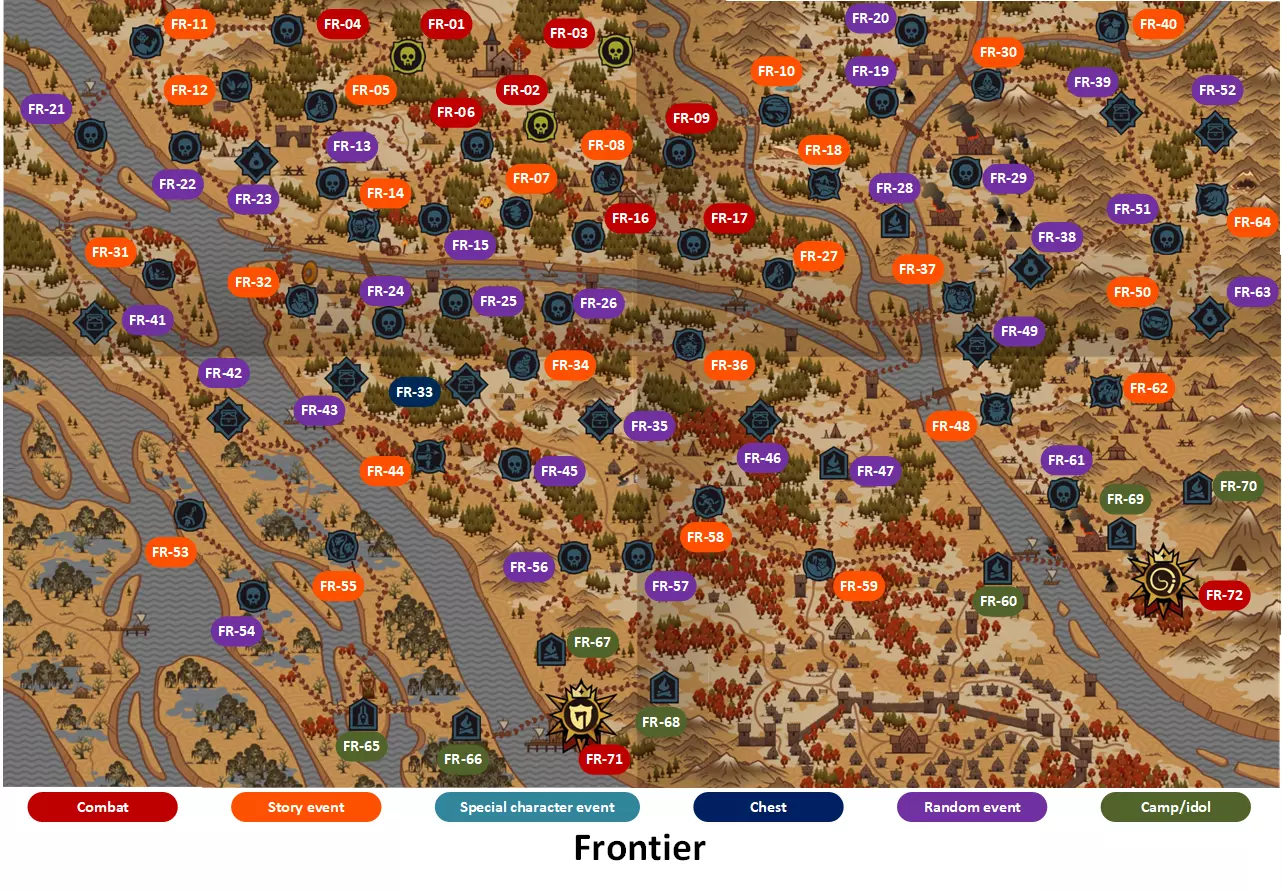 游戏通用技巧 1. 若无法完成游戏,建议先完成挑战。所有英雄都将获得大幅强化,并能解锁大部分成就。 2. 无需刻意追求难度等级,你总能顺利达到5级。 3. 不要吝惜金钱来移除基础卡牌。这能让你更轻松地将卡牌升级至满级。 4. 不要在卡组中收集过多卡牌,否则会增加构建策略的难度。卡牌会从牌库中抽取,所以卡牌数量少意味着卡牌升级程度更高,且抽取频率更高。 5. 有时你无法完成特定英雄的任务,这意味着你需要收集尽可能多的相关线索,莫蒂斯会将这些线索传递给另一位英雄,你将为这位英雄达成故事结局。6 - 本指南仅描述获取成就的方法,通常是较简单或较有趣的方式。但请始终记住 - 成就也可以通过其他方式获得。 区域地图 为方便导航和定位,下方提供了带有每个地点字母数字代码的区域地图。这些代码随后将添加到成就描述中。 边境地图