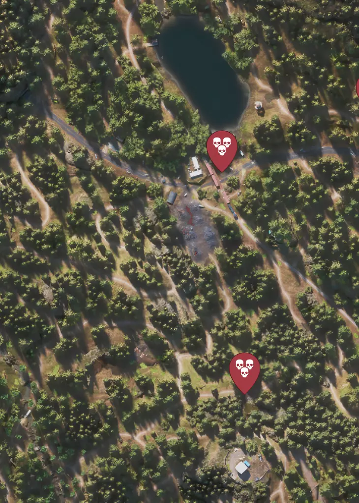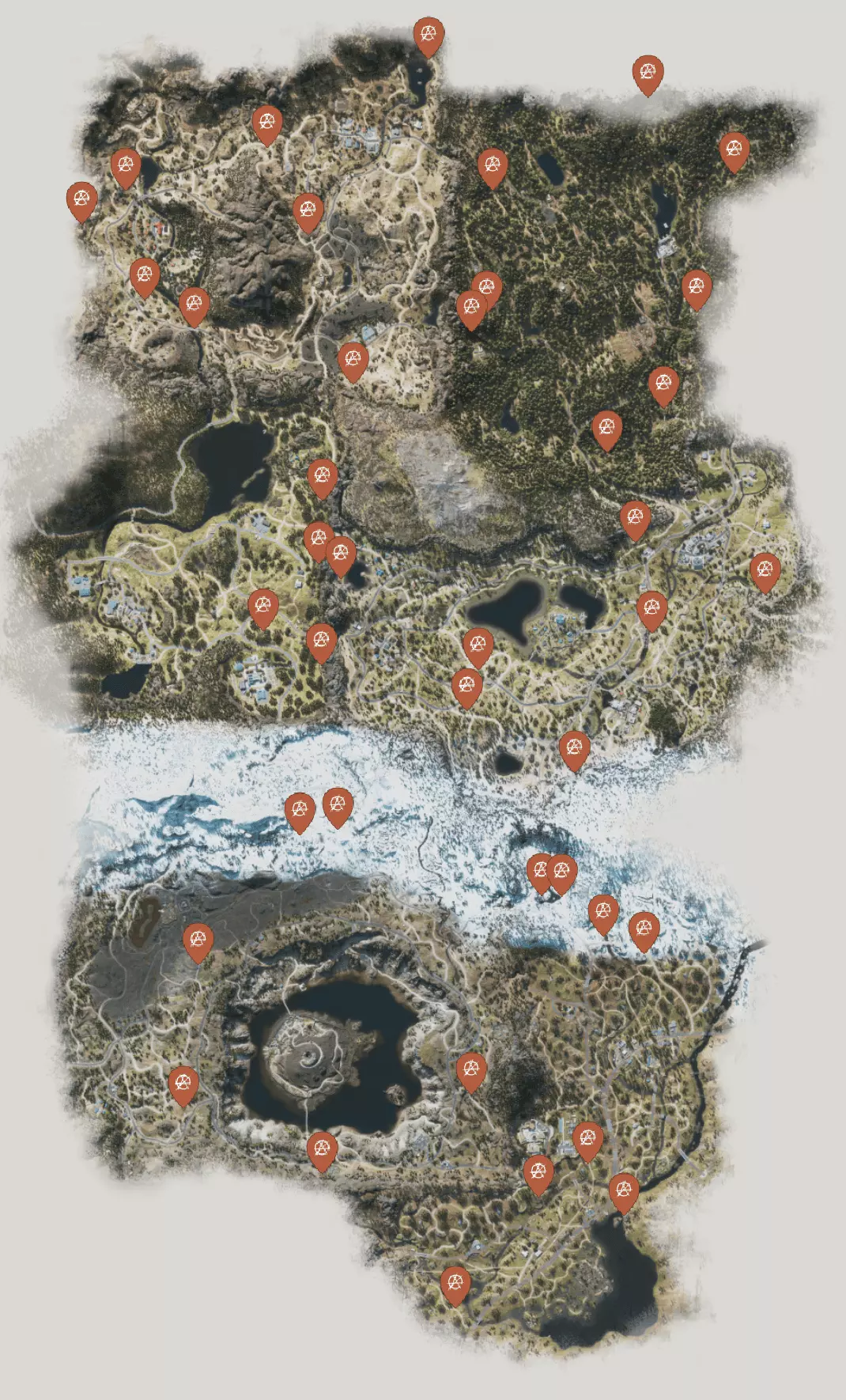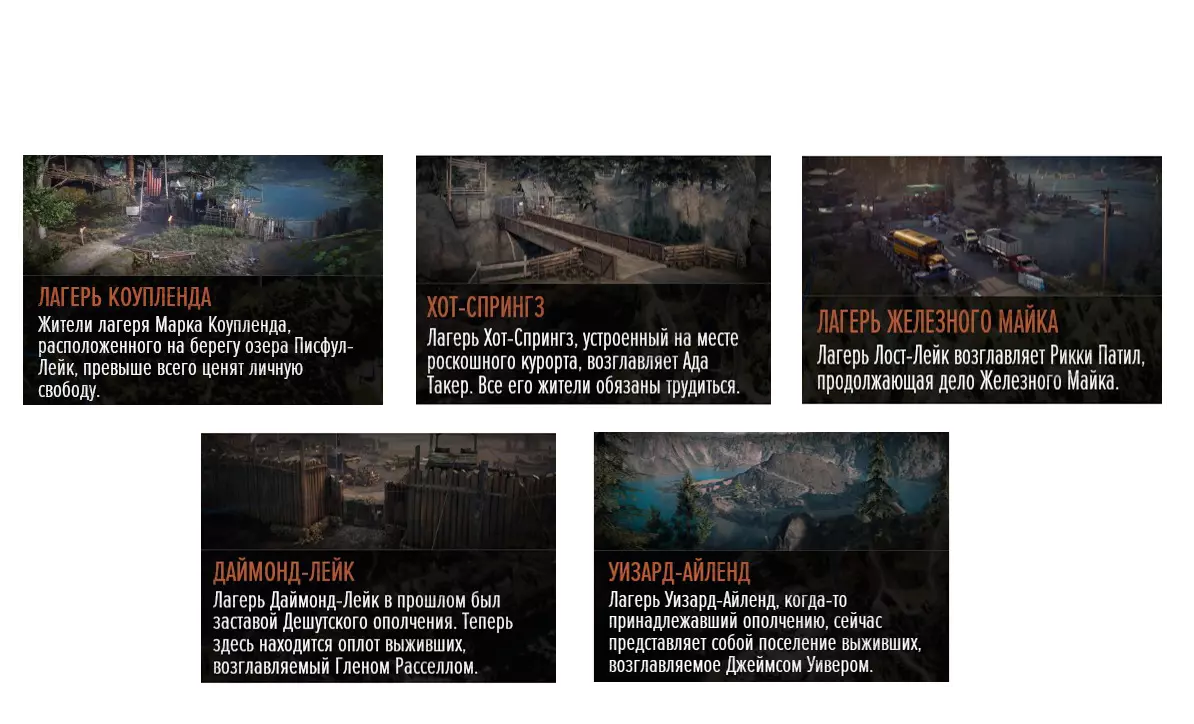 整个游戏地图分为6个区域: 喀斯喀特。 贝尔纳普。 失落湖。 铁屁股(Iron Butte)。 火山口湖。 97号公路。 需要在任意区域清理所有伏击营地、感染区和NERO检查点。 - 通过试炼 重在参与 | 光荣的第二名 | 金童