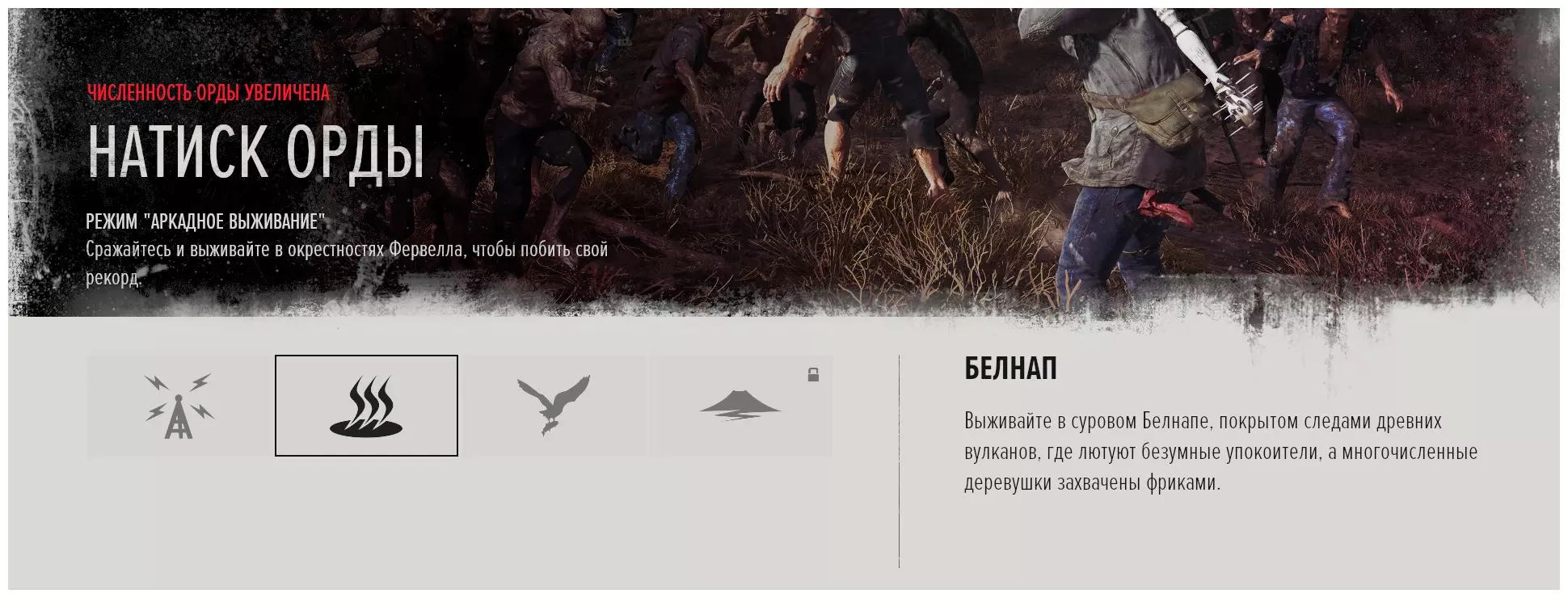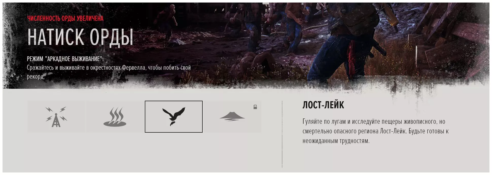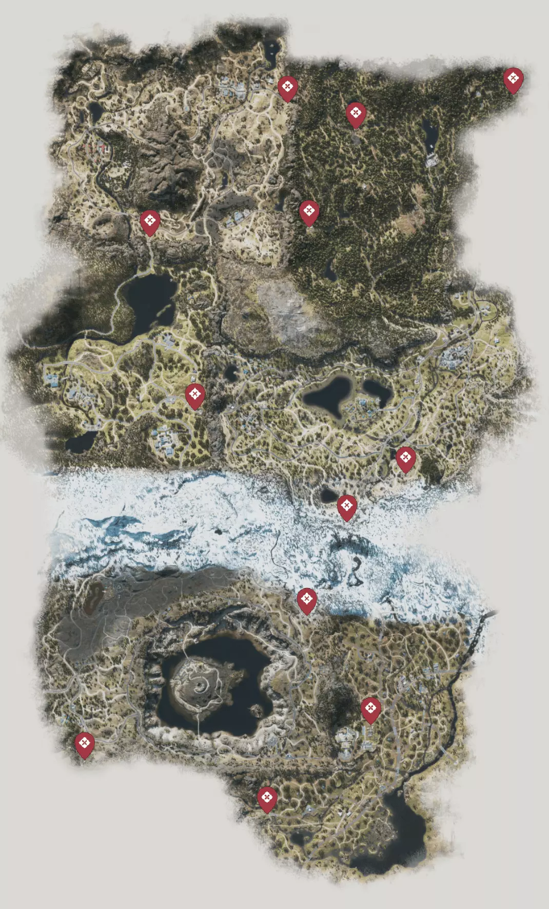 整个游戏地图分为6个区域: 喀斯喀特。 贝尔纳普。 失落湖。 铁屁股(Iron Butte)。 火山口湖。 97号公路。 需要在任意区域清理所有伏击营地、感染区和NERO检查点。 - 通过试炼 重在参与 | 光荣的第二名 | 金童