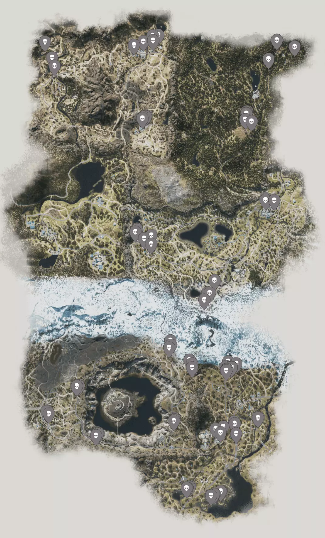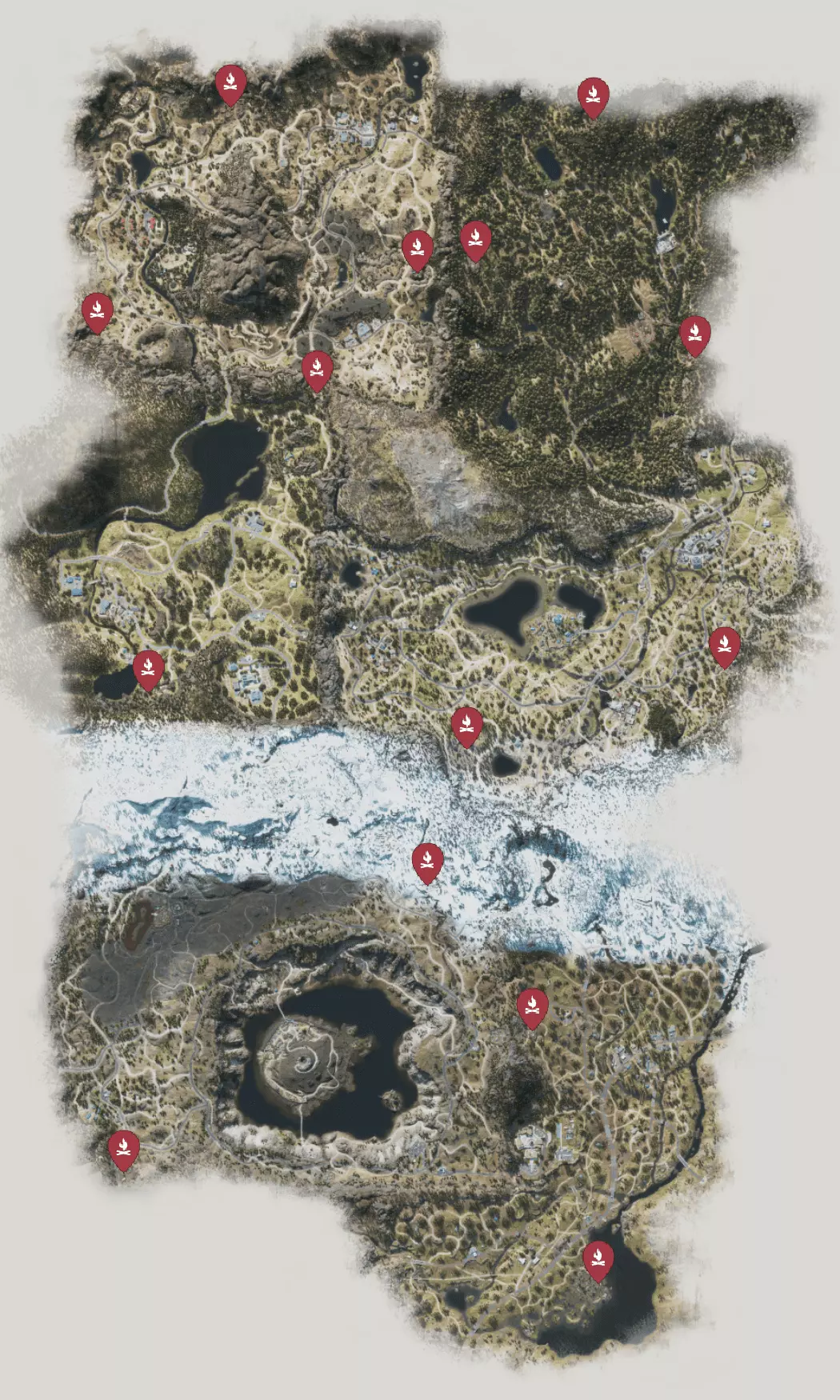 游戏中共有14个伏击营地。下方为标注了全部14个营地位置的地图。到达任意一个营地后,你需要先像清理掠夺者营地一样清除该区域的敌人。不过,在清理完伏击营地后,你需要找到地下掩体,它将作为你的安全地点和开放世界中的快速旅行点。此外,在掩体中总会放有一张小地图,它会为你解锁一部分游戏地图,并标记出一些收集品的位置。